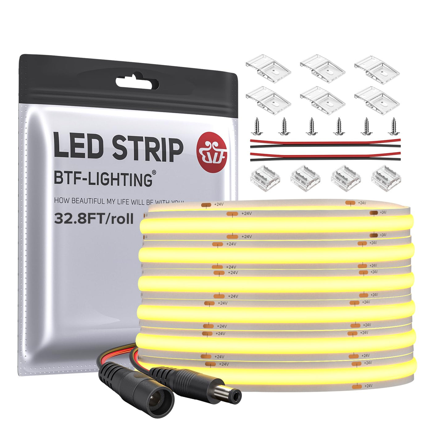 Illuminate your space with the BTF-LIGHTING FCOB LED Strip Light, featuring cutting-edge technology and superior performance. This 32.8FT Warm White 3000K LED strip is perfect for both residential and commercial applications, providing bright and uniform lighting that enhances any environment.