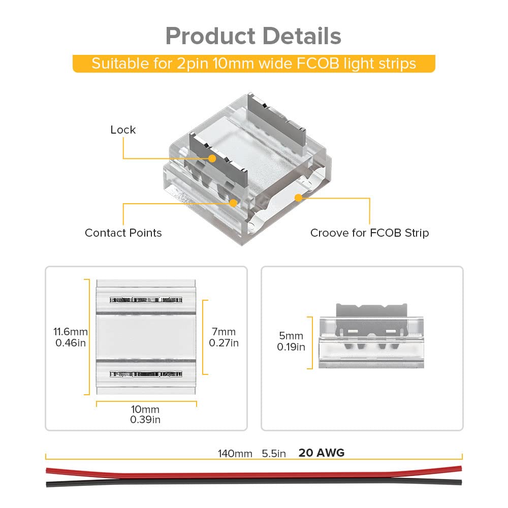 Q: Is this connector kit compatible with all LED strips?A: No, this connector kit is specifically designed for 10mm width FCOB COB LED strip lights and may not be compatible with other types of LED strips.
