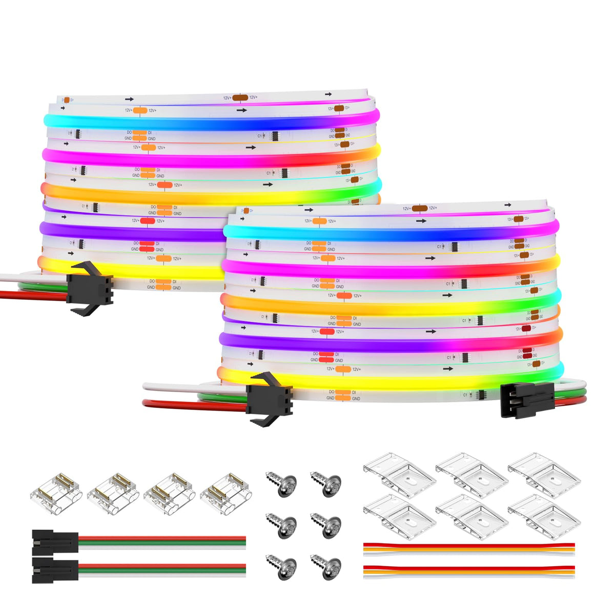 The LED strip features advanced Flip Chip On Board (FCOB) technology, ensuring high brightness and uniform light distribution. This innovative design eliminates dark spots, providing a soft and consistent glow that enhances the ambience of any room. Compatible with several programmable and music controllers, this flexible LED strip allows for an array of stunning lighting effects and color combinations, from static colors to dynamic displays.