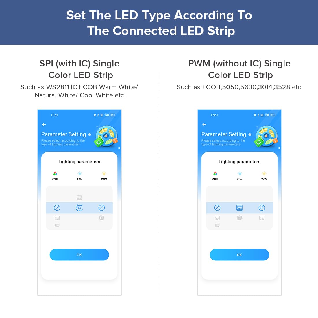 Q: What types of LED strips are compatible with the BTF-LIGHTING SP530E Controller?A: The BTF-LIGHTING SP530E WiFi & Bluetooth Controller is compatible with various types of LED light strips, including PWM 2CH Single Color LED Strips (without IC) and SPI Single Color LED Strips (with addressable IC chip).