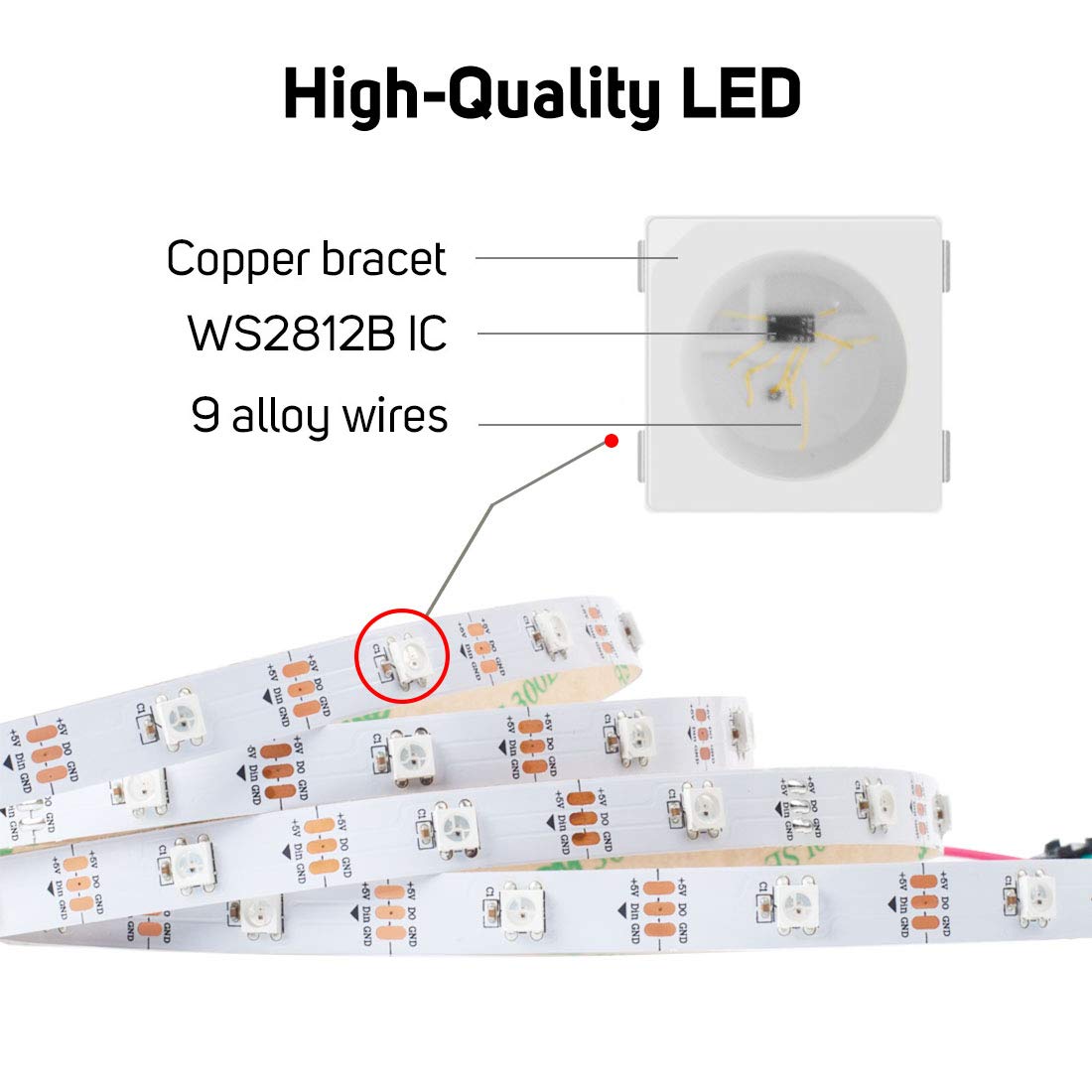 Q: What is the length and pixel density of the BTF-LIGHTING WS2812B LED strip?A: The BTF-LIGHTING WS2812B LED strip measures sixteen point four feet in length and features thirty pixels per meter, totaling one hundred fifty pixels across the entire strip.