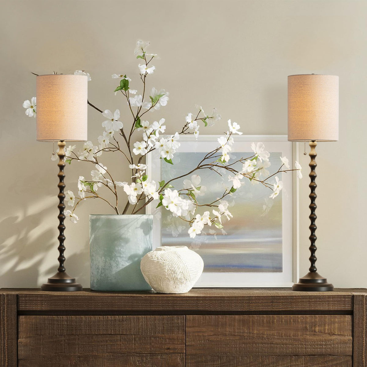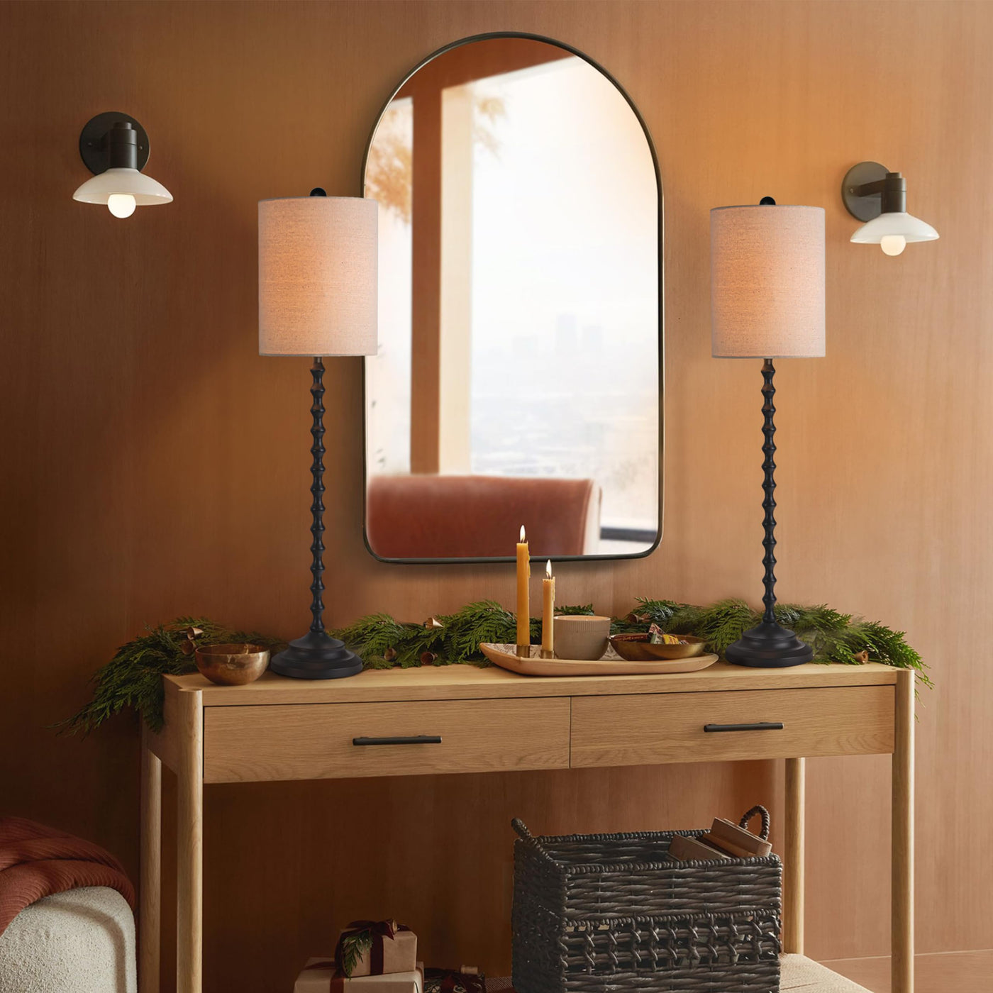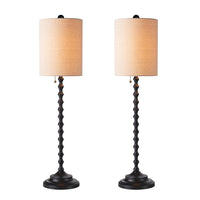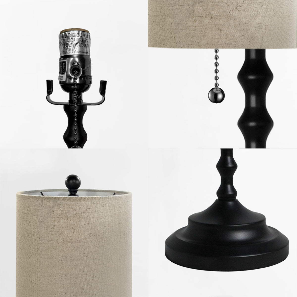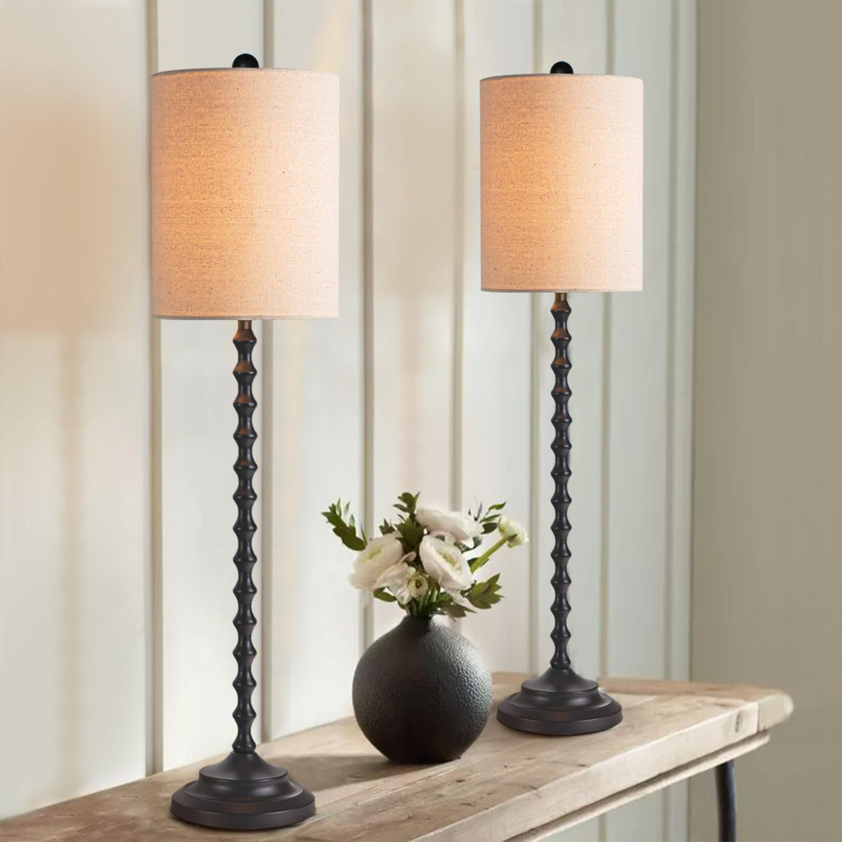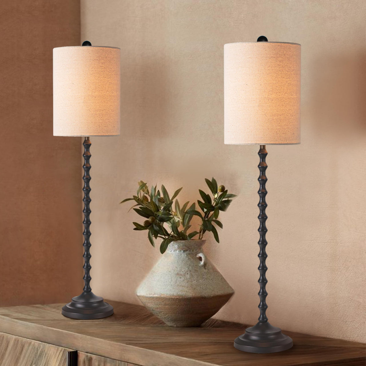 These buffet table lamps boast a tall, slender silhouette perfect for a sideboard or console table. Each lamp has a smooth black finish for a classic handsome look and is topped by a drum shade with a round finial. Simple and stylish, these buffet table lamps will provide a coordinating look for your living space. It is a perfect blend of elegance and practicality. These meticulously crafted lamps are designed to elevate your home decor while providing versatile and beautiful lighting solutions for different occasions.