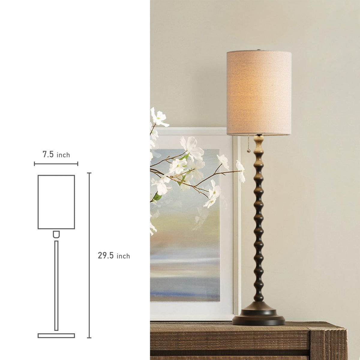 Q: What is the height and size of the buffet table lamps?A: Each lamp in the Buffet Table Lamps Set stands 29.5 inches tall, with a base width of 6 inches. The lampshade measures 7.5 inches wide at the top and bottom, and it is 9.5 inches high.