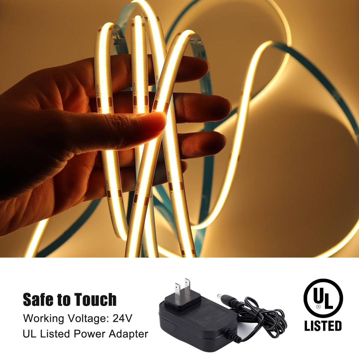 Q: Are the BUNACET COB LED strip lights safe to use?A: Yes, the BUNACET COB LED strip lights operate on a low voltage of 24V, ensuring they are safe and touchable. Additionally, they offer good heat dissipation performance, reducing the risk of overheating, making them a reliable lighting option for any indoor setting.