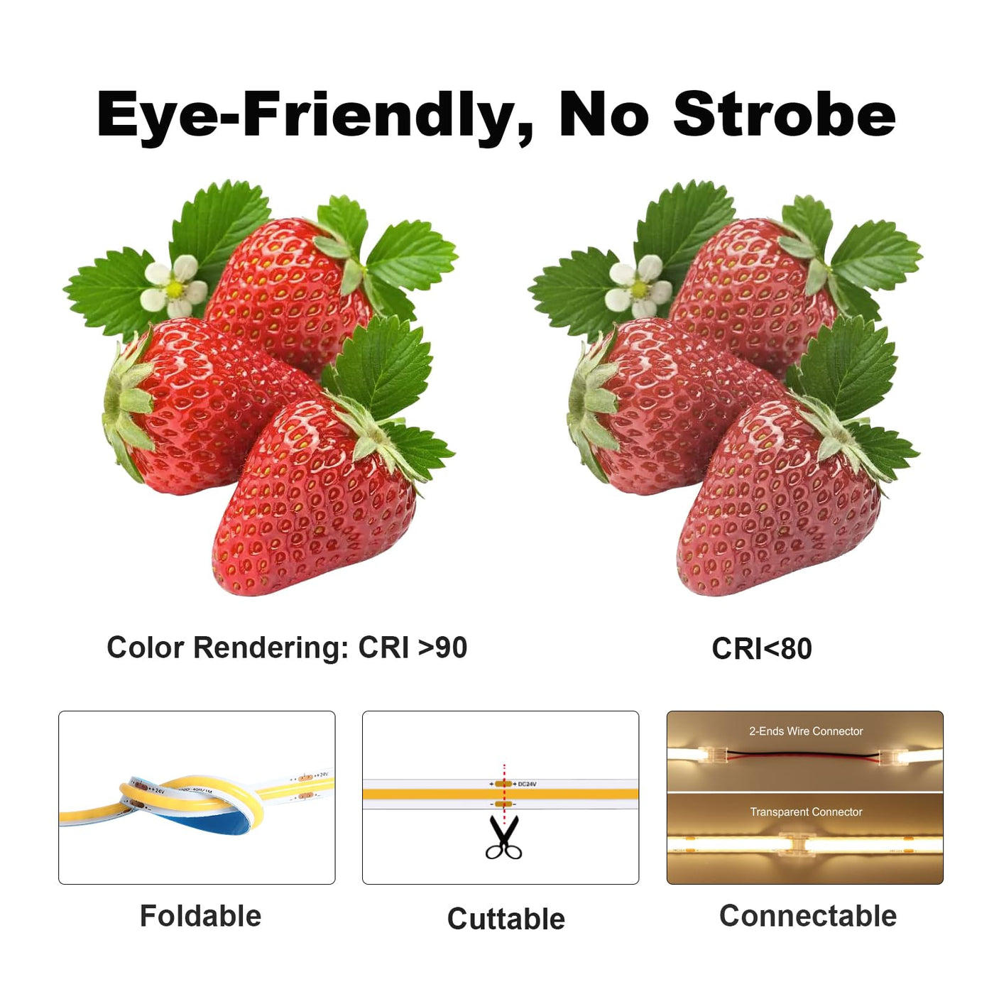 Q: Can I cut the BUNACET COB LED strip lights to fit my space?A: Yes, the BUNACET COB LED strip lights are cuttable, allowing you to trim them to your desired length. This feature enables you to customize the lighting to fit specific areas or projects, and you can easily connect the cut sections using 2 Pin connectors.