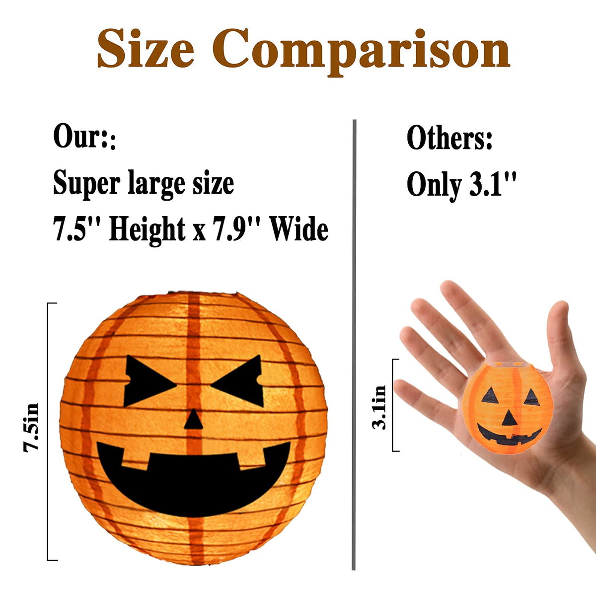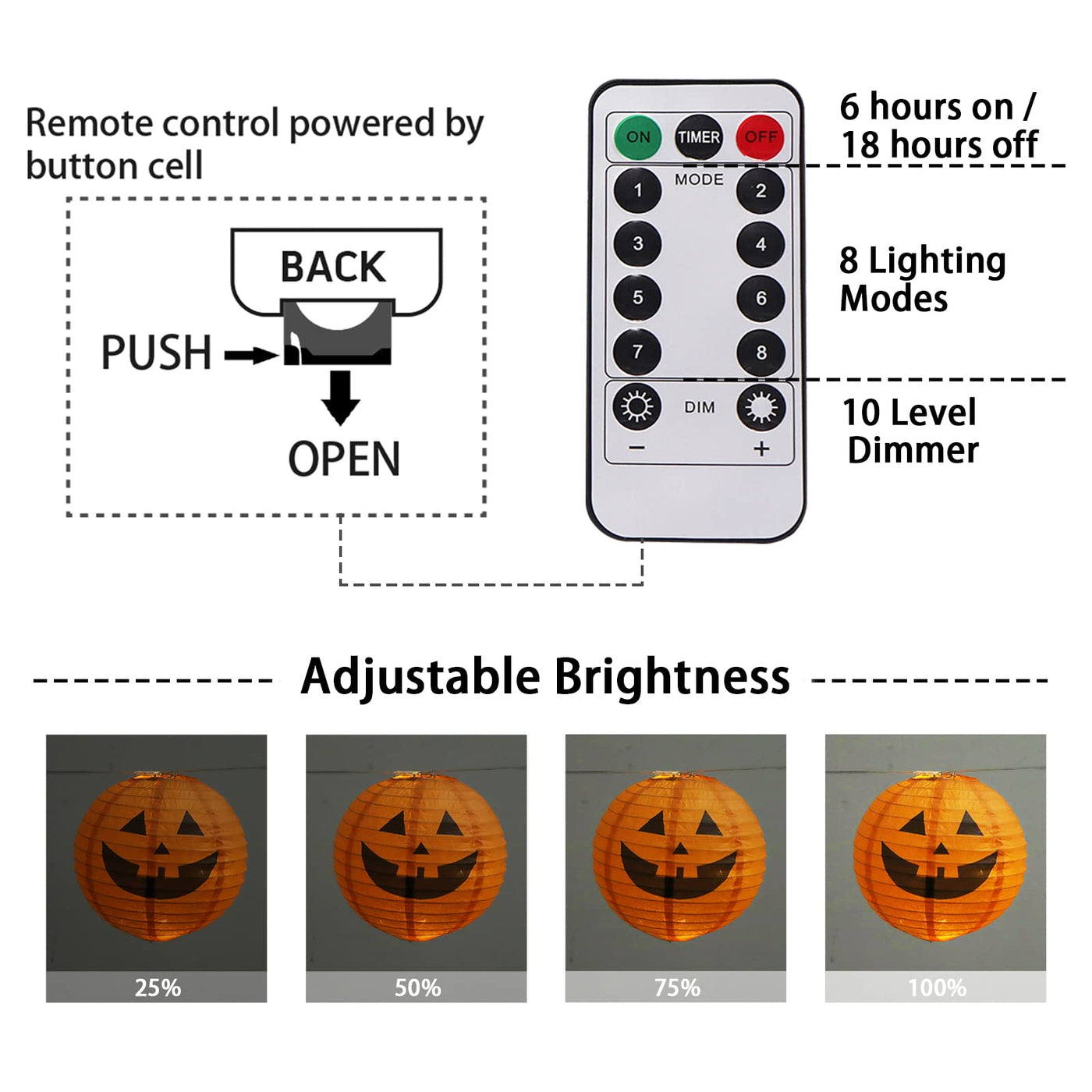 Package Includes: ❖ 8 x Pumpkin Paper Lanterns ❖ 1 x String Lights ❖ 1 x Remote Control Specifications: Style: Pumpkin String Lights Quantity: 8 Paper Lanterns + 1 String Lights + 1 Remote Control Material: Plastic & Paper String light Size: 19.5ft/6m Lantern size: 7.9x 7.5 / 20 x 19 cm (Width x Height) LED Color: Warm white LED Quantity: 48 LEDs Spacing between bulbs: 29.5 inch Waterproof Level: IP65 Recommended Usage: For halloween decorations, holidays decor and halloween party supplies. For home, office, yard, any indoor or outdoor scenes. For any age group, except children under 8 years old. Notes and Instructions: Not a toy. For decoration use only. Please get away from fire.