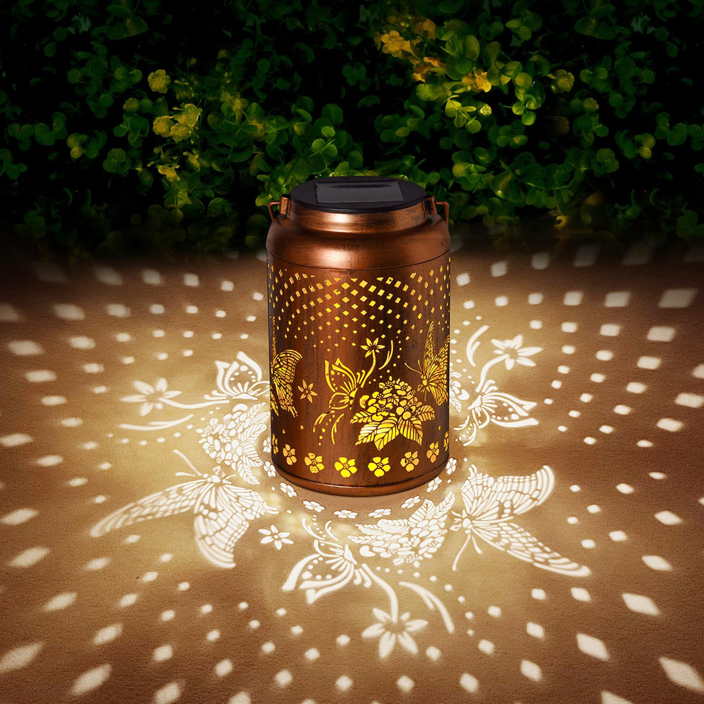 Q: What materials are used to make the Butterfly Solar Lantern?A: The lantern is handcrafted from high-quality metal, featuring a vintage gold copper color with a hollow design. This ensures both durability and an attractive aesthetic for your outdoor decor.
