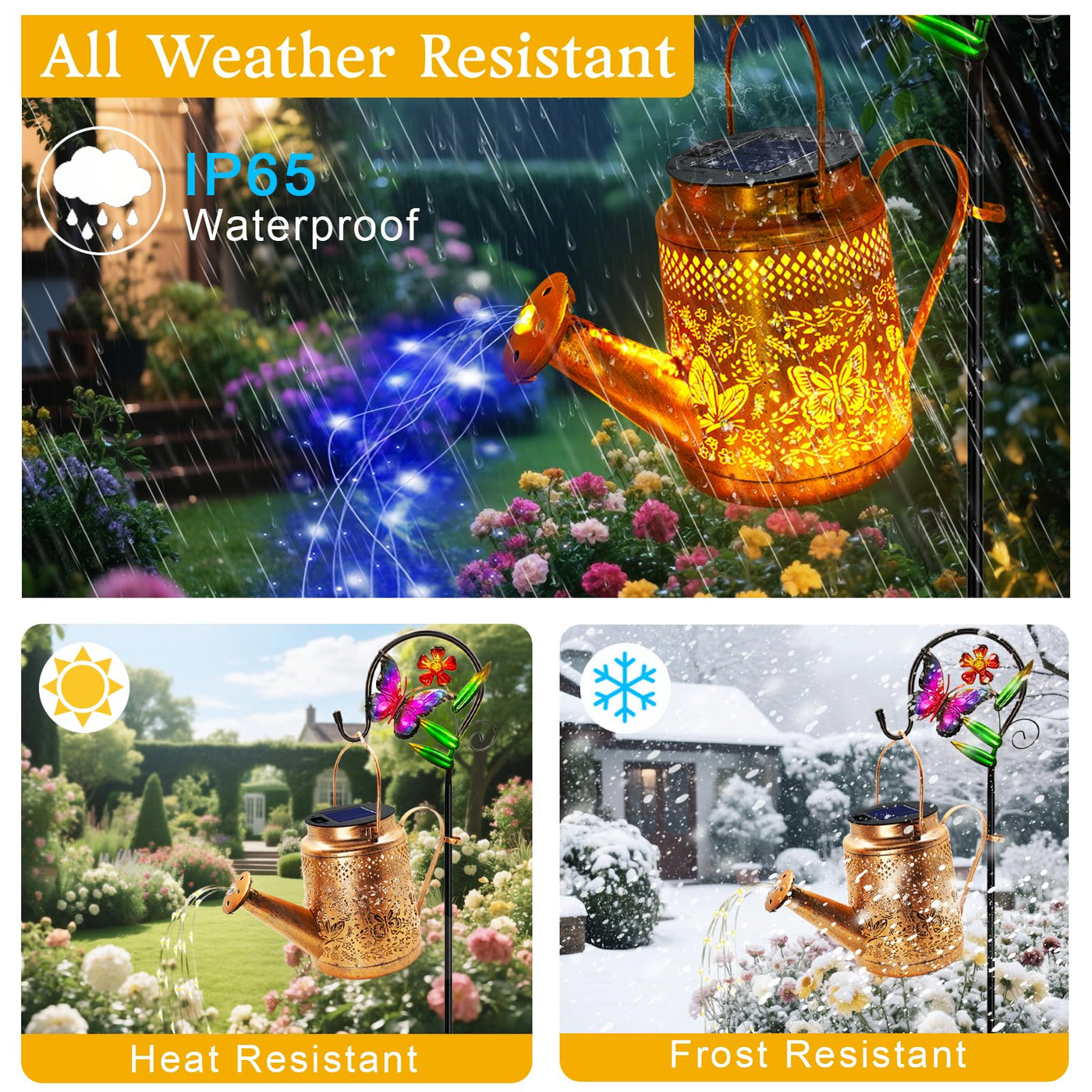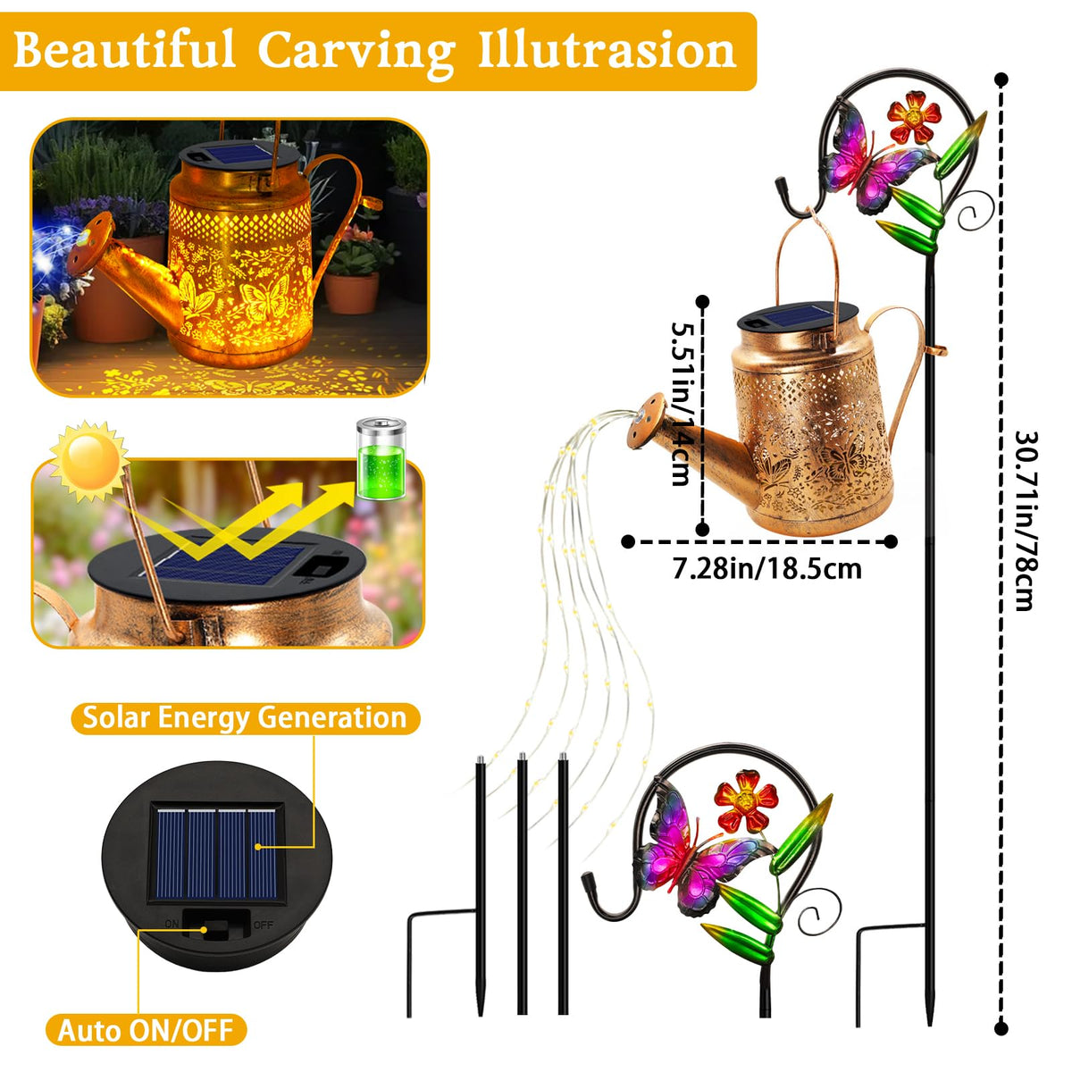 Our Solar Watering Can Lights Is An Eye-Catching Garden Decor For Your Flower Garden The Watering Can Lantern Will Cast Unique Sun&Moon Pattern On The Ground And Surrouding Plant And There Are 6 Strands Led Lights Comes Out From The Watering Can Simulates Real Watering Effect Bring You Into Whimsical Fairy Garden World. Also We Provide A Durable Shepherd Hook For For You DonT Need To Buy Other Accessory Any More!