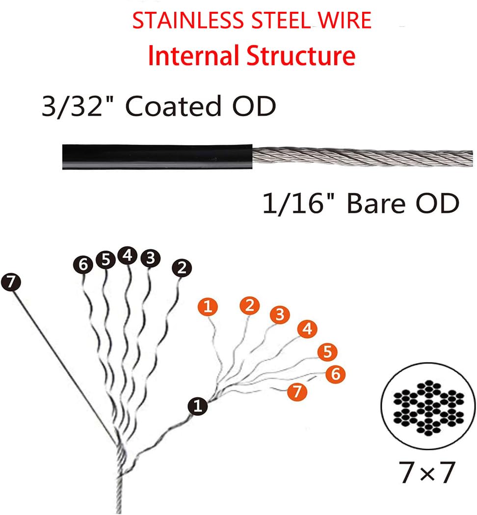 Features: - This Vinyl-Coated Stainless Steel Cable Perfect for hanging outdoor string lights. - Safe and durable Black Vinyl-Coated cable kit is insulated and waterproofed and it is made of 304 stainless steel(7*7).it is firm and rustless. - Convenient assembly and disassembly kit Each part is connected by thread,very easy to install and remove. - Enhance any outdoor atmosphere by easily setting up the String Lights Hanging System, Extra Pieces added for impact resistance. - Everything you need in 1 complete pack.