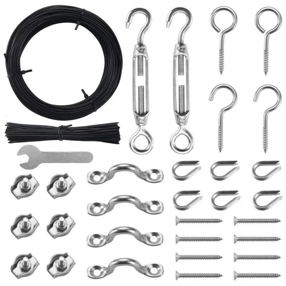 Package includes: 1 × User Installation Manual 1 × 100 Feet Wire Rope Cable 2 × Turnbuckle 4 × Eyes Hook 70 × Black Twist Cable Ties 4 × Eye Strap 6 × Thimble 8 × Scews 6 × Rope Clamp 1 × Included Small Wrench