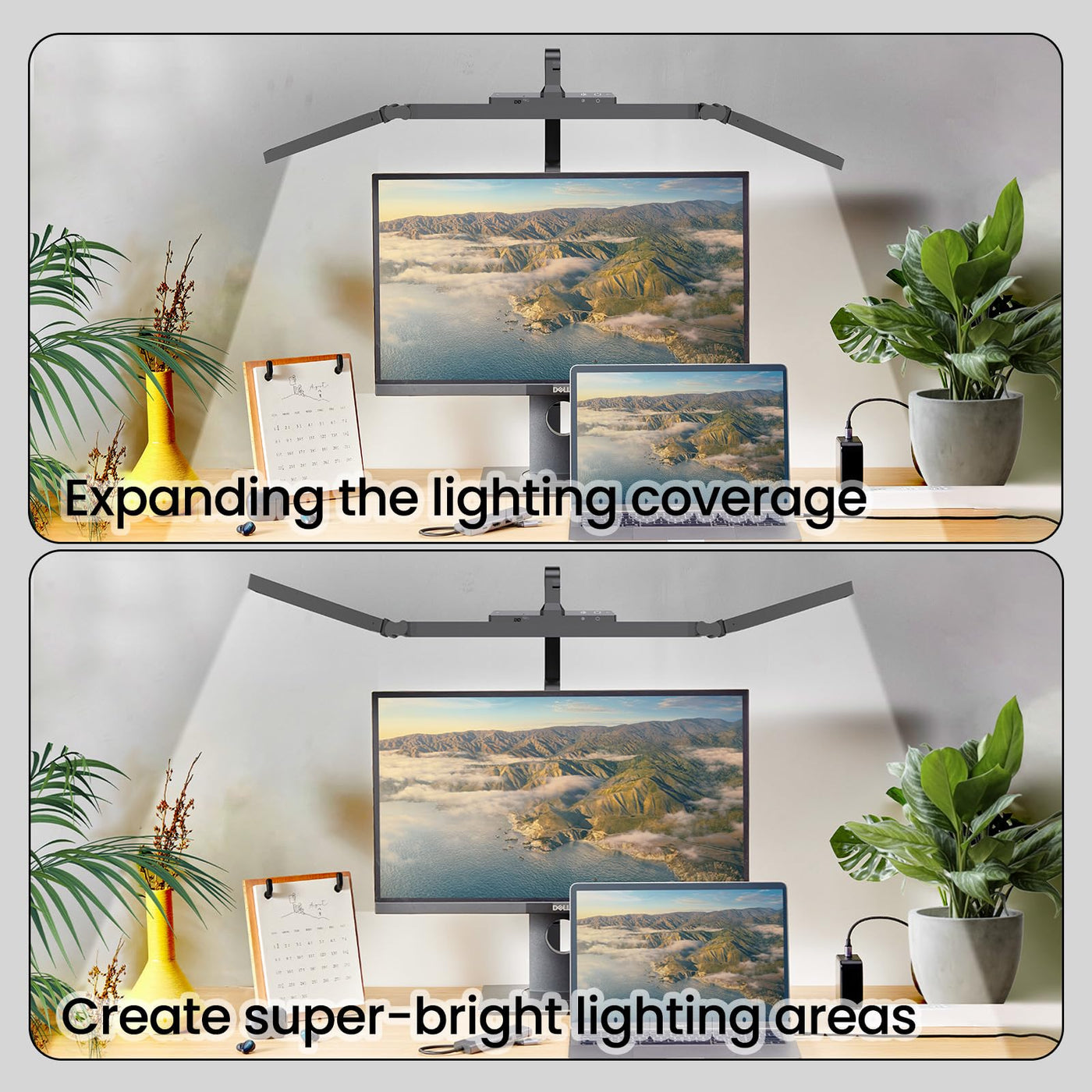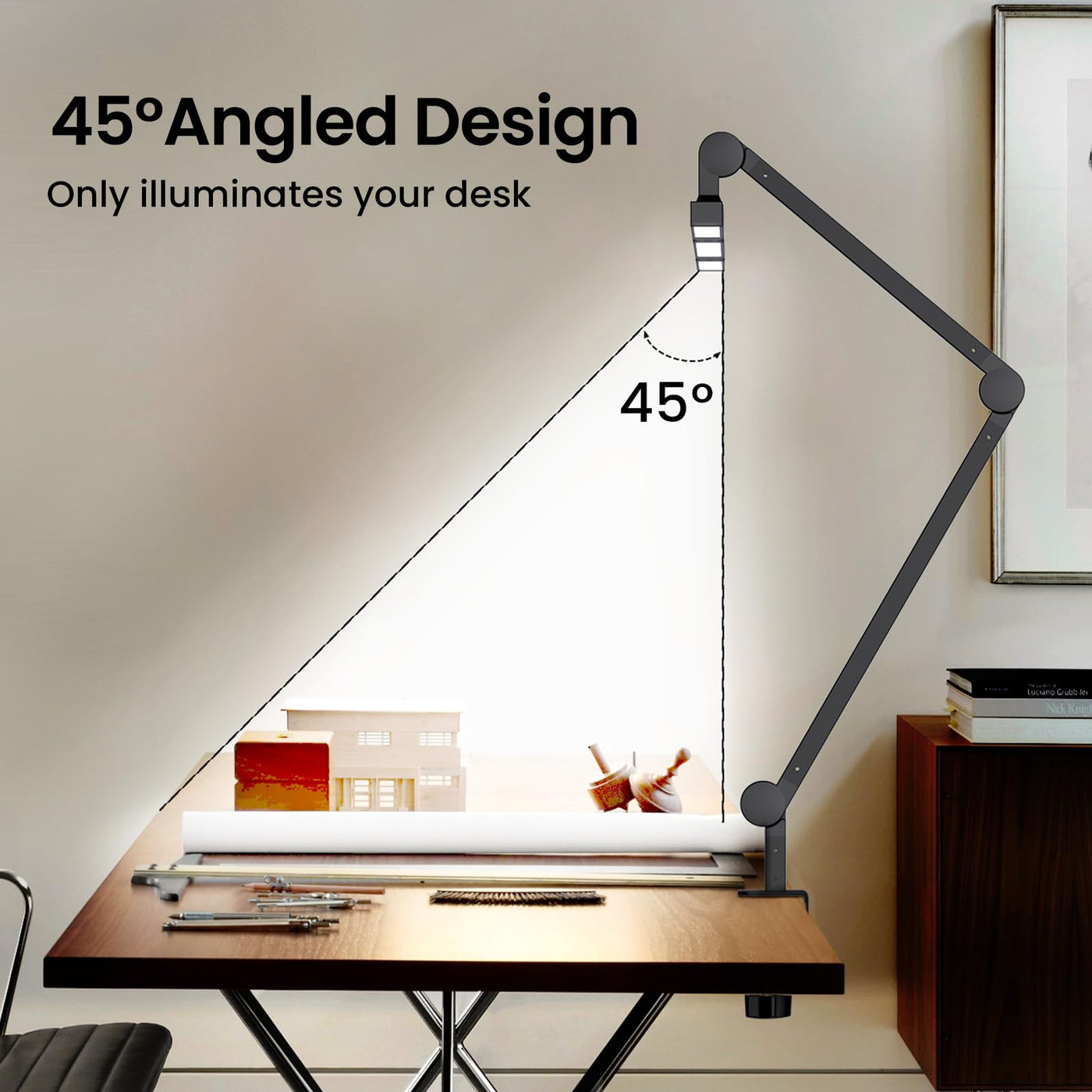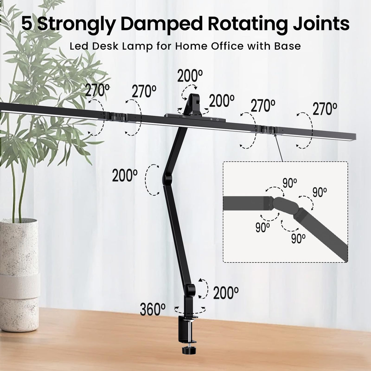 [7 Rotatable Joints]: Our BZTA swing arms LED desk light boasts 7 robustly damped joints and features a design with 3 ultra-bright light bars, offering seamless vertical and horizontal adjustment. Rotate the bilateral light bars vertically to customize the illumination angle, expanding the lighting coverage to brighten your entire desk. Additionally, the base can be rotated to adjust the light direction and position according to your preferenc | [45°Angled Away Asymmetric Light]: Our clamp light's main light utilizes 45° angled away LEDs and side lighting design, exclusively illuminating your desk and keyboard while minimizing glare on screens and eyes. This thoughtful design reduces screen reflection, alleviating eye fatigue. Ideal for reading, studying, drawing, painting, design, and artwork, this office light enhances productivity and comfort. | [Ambient Lighting & Smart Infrared Sensor]: The upward-shining bilateral auxiliary lights function as ambient lights to alleviate eye strain. Equipped with a built-in light sensor, our desk lamp automatically adjusts brightness to a comfortable level based on surrounding light conditions. While the main light and auxiliary lights require separate on/off controls, brightness and color temperatures are synchronized for ease of use. | [CRI>90 Eye Protection Technology]: Featuring CRI>90 high color rendering index LEDs, our BZTA 24W table lamp produces soft, flicker-free, and anti-glare light, accurately rendering colors and reducing blue light hazards. Designed to mimic natural light, it minimizes eye strain during extended use. The left auxiliary light can also be rotated downward to eliminate shadows, ensuring optimal lighting conditions for various tasks. | [Multiple Lighting Combinations]: Our BZTA office desk lamp offers extensive brightness adjustment options, including multiple color settings spanning a white-and-yellow spectrum. Use the touch panel to adjust brightness and color temperature across 4 levels incrementally, or long-press for seamless dimming (25% - 100%) and temperature adjustment (3000K - 6500K). The memory function retains your last setting for added convenience and ease of use. | NOTE:When powered on, long pressing the color temperature button can initiate and deactivate gestures