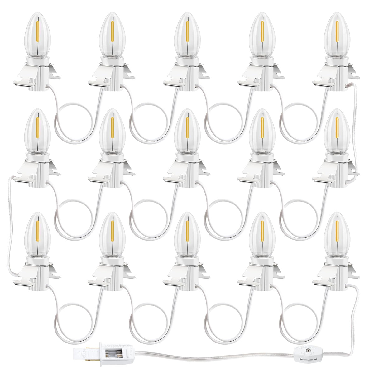 Accessory Cord with 15 Lights: you will receive 15 pieces LED bulbs and 1 pieces power cords with plug, has 15 clear light bulbs, with on/off switch and Outlet, Each light is 11.8 inches apart, a total length of 17.7 feet. These replacement bulbs are warm white, size C7/E12, 0.6W bulb Package Content: 1 x C7 Accessory Cord with 15 LED Light Bulbs, 17.7 feet in length with plug and switch