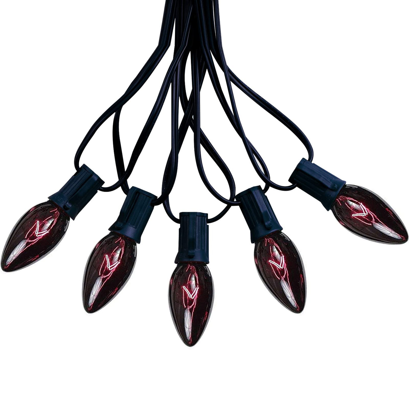 Q: What are the dimensions and specifications of the C9 Black Halloween String Lights?A: The C9 Black Halloween String Lights measure 25 feet in length and come with 26 black light purple bulbs, including one spare. Each bulb is designed for 7W/120V and features C9 or E17 intermediate bases, making them suitable for both indoor and outdoor use.