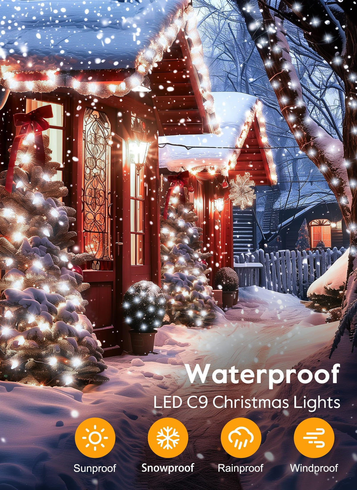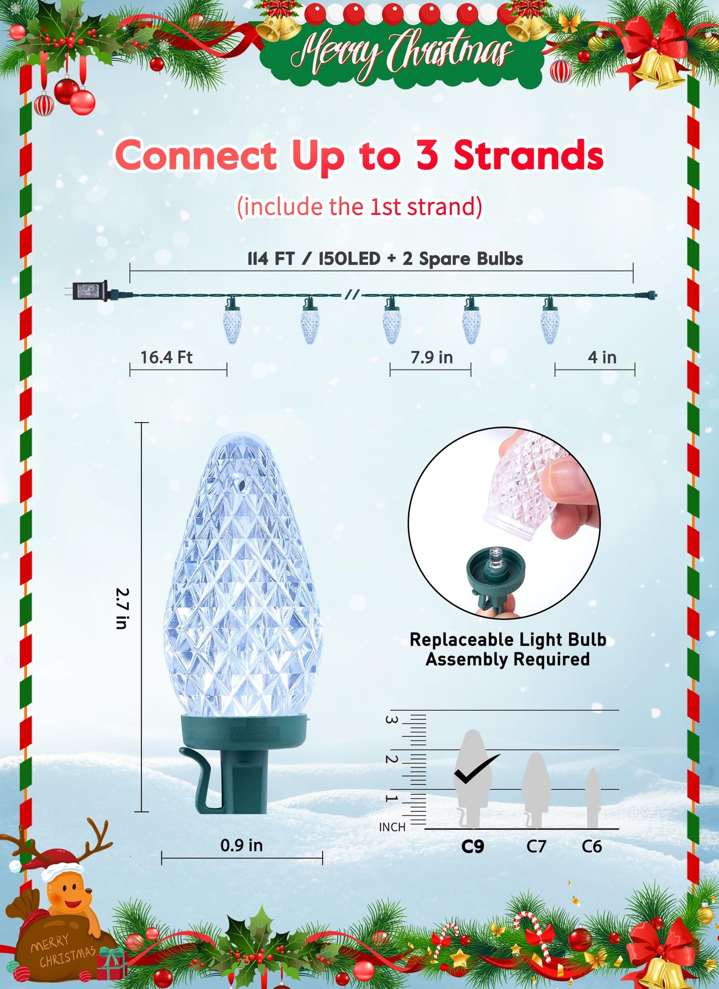 C9 Christmas Lights Outdoor 114 Feet 150 Led C9 String Light With Timer & 8 Light Modes Waterproof Commercial Grade Connectable Christmas Tree Lights For House Indoor Outside Roofline Pure White