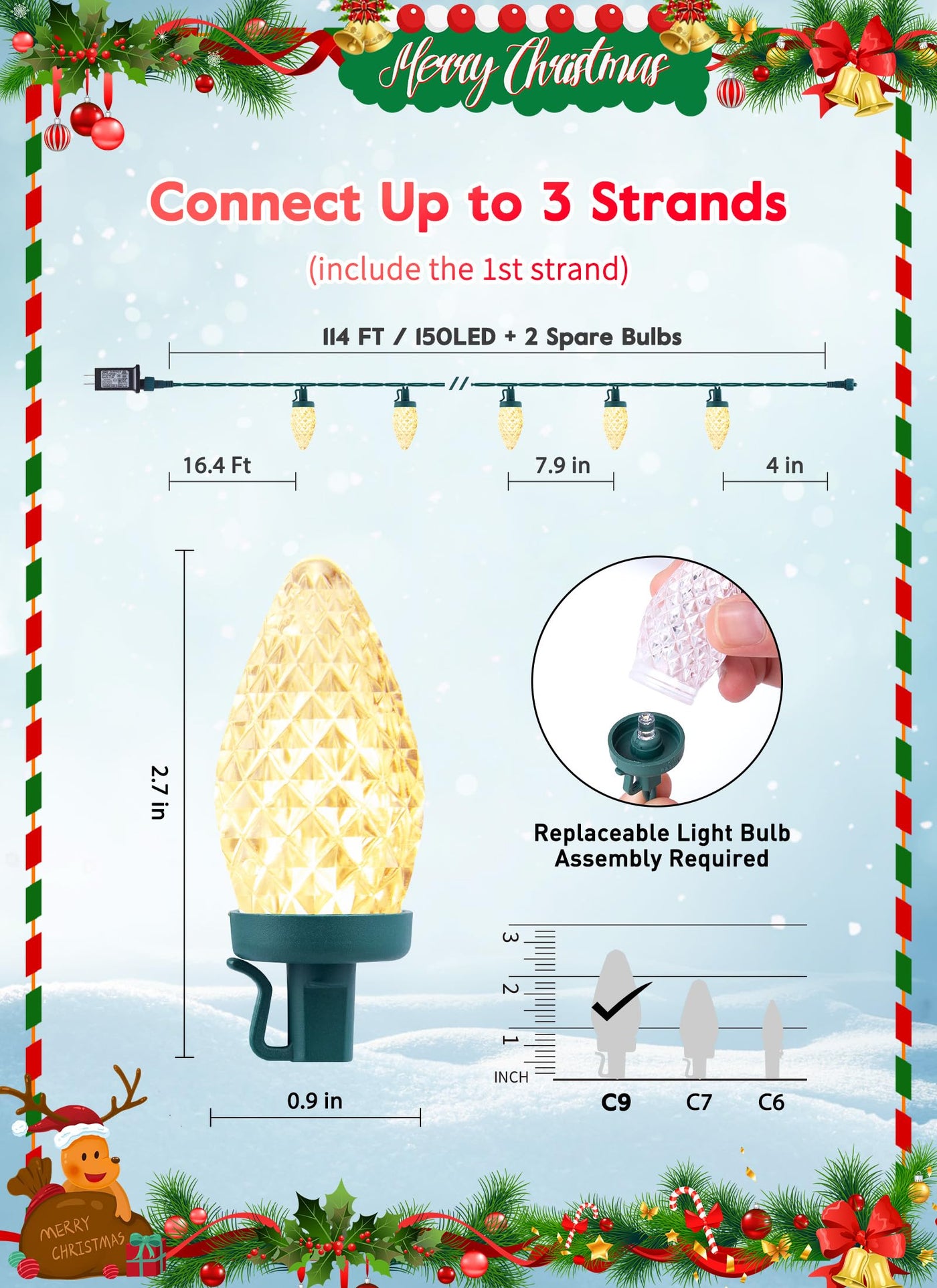 Using this LED C9 string lights to sparkle your home rooflines, patio, deck, fence or garden! SPECIFICATIONS: Total length: 114 feet Lighted length: 97.6 feet Lead cord: 16.4 feet Bulb spacing: 7.9 inches End cord length: 4 inches 8 Lighting Modes Timer Function: 6H on & 18H Off (Hold the transparent button for 3 seconds. The green light will turn on, starting the 6H on/18H off timer)Memory Function Bulb type: LED Shade material: plastic LED bulb quantity: 150 pieces (2 spare bulbs)Connectable: 2 sets(including first set) LED bulb wattage: 0.06W per bulbBulb lifespan: 25,000H Lighting color: Warm WhiteCable color: dark green Waterproof grade: IP44 Power input: 120V~ 60Hz Package Includes: 1 x C9 Xmas Lights 1 x Adapter 1 x Users Manual For Superior LED String Lights for Holiday, SELECT and ORDER NOW!