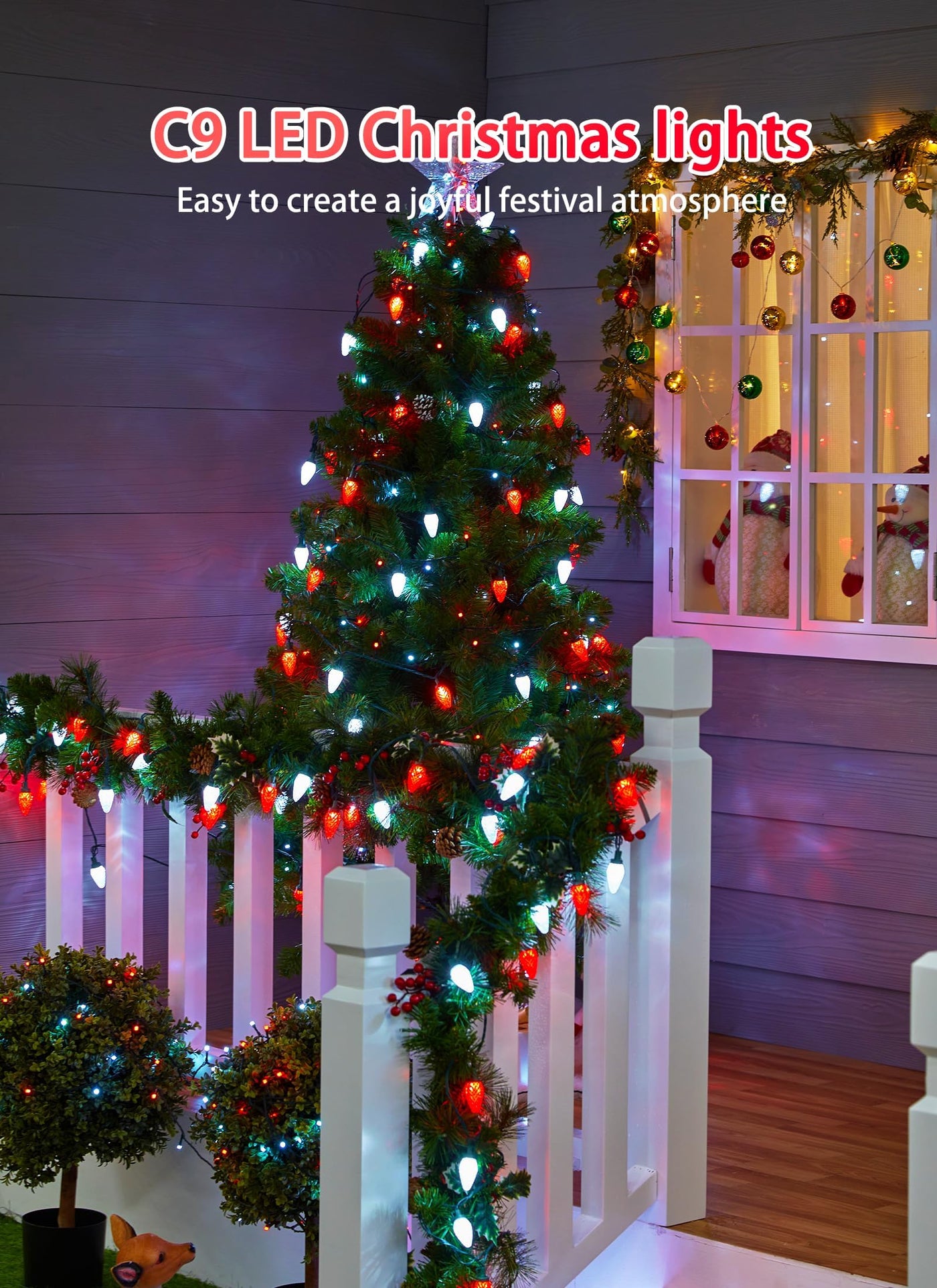 Using This Led C9 String Lights To Sparkle Your Home Rooflines Patio Deck Fence Or Garden! Specifications: Total Length: 114 Feet Lighted Length: 97.6 Feet Lead Cord: 16.4 Feet Bulb Spacing: 7.9 Inches End Cord Length: 4 Inches 8 Lighting Modes Timer Function: 6H On & 18H Off (Hold The Transparent Button For 3 Seconds. The Green Light Will Turn On Starting The 6H On/18H Off Timer)Memory Function Bulb Type: Led Shade Material: Plastic Led Bulb Quantity: 154 Pieces (4 Spare Bulbs)Connectable: 2 Sets(Including First Set) Led Bulb Wattage: 0.06W Per Bulbbulb Lifespan: 25 000H Lighting Color: Red And Pure Whitecable Color: Dark Green Waterproof Grade: Ip44 Power Input: 120V~ 60Hz Package Includes: 1 X C9 Xmas Lights 1 X Adapter 1 X Users Manual For Superior Led String Lights For Holiday Select And Order Now!
