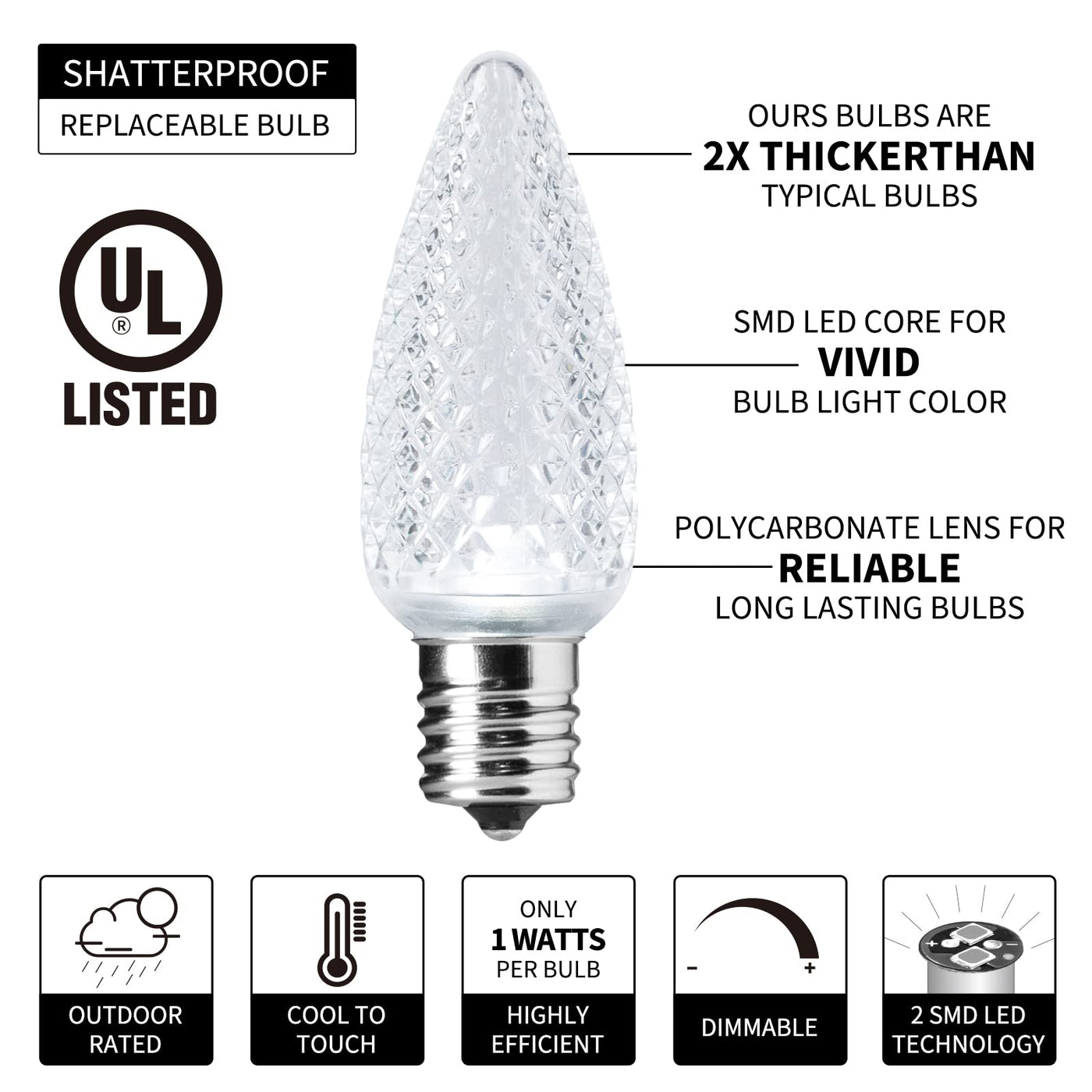 C9 Led Christmas String Outdoor/Indoor Lights With 50 C9 Strawberry Bulbs The Strong Construction And Plastic Shade Make C9 Led String Lights Tough And Sturdy, Not Easy To Damage And Keep At A Low Temperature State After Long Hours Of Usage. Brightown Lighting Perfect For Weddings, Parties, Tents, Patios, Awnings And Christmas Decor. Add An Inviting Glow To Your Space With The Weather Resistant String Of C9 Strawberry Bulb Lights.Specs Bulb Count: 50. Bulb Spacing: 12 In. Diameter Of Bulb: 1.5 In. Bulb & Socket Type: C9 / E17 Base. String Length: 50 Ft. Lifespan: 15000H.Ul Listed For Indoor & Outdoor Use.Connect Up To 8 Strands.