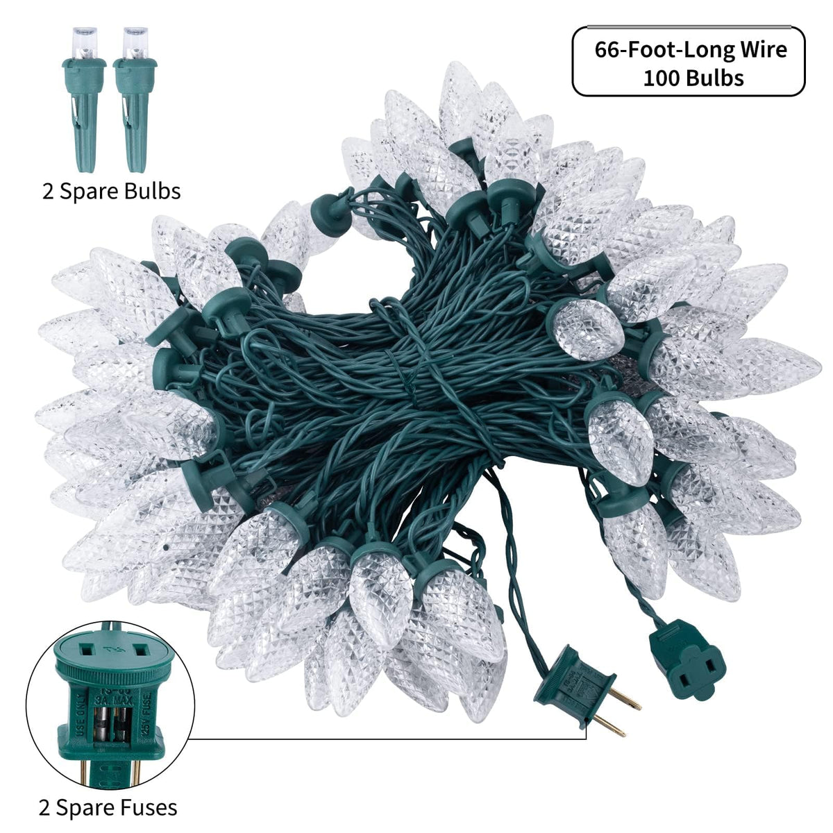 66 Ft Plug-In C9 Led Christmas String Lights - Decorate A Cheerful Christmas ? The Plug-In C9 Green Wire Lights Are 66 Feet Long With 100 Bright Strawberry-Shaped Leds. The Heavy-Duty Wiring And Bigger-Sized Led Bulbs Will Add A Cheerful And Romantic Touch To Your Indoor And Outdoor Space. ? You Can Connect Up To 33 Sets Of These Christmas String Lights End To End, Which Is Incredibly Convenient For Decorating Vast Areas Or A Sizeable Outdoor Object - Such As Your Roofline Or An Oversized Tree. ? Take These Lovely C9 String Lights To Explore A Fascinating Christmas Season. It Is Ideal For Christmas Trees, Rooflines, Fences, Porches, Yards, Patios, Etc. Features ? Plug-In Power Supply Ensure Super Bright Glow ? 100 Energy-Efficient Shatterproof Plastic Led Bulbs ? 66-Foot-Long Durable Heavy-Duty Green Wire ? Ability To Connect Up To 33 Strands To Decorate Larger Space ? Ip44 Waterproof For Indoor And Outdoor Use ? Built-In Clips For Easy Hanging ? Super Long 20,000-Hour Lifespan Specifications ? Bulb Type: Led Bulb ? Bulb Quantity: 100+2 Bulbs ? Bulb Lifespan: 20,000 Hours ? Bulb Spacing: 8 Inches ? Cord Length: 66 Feet ? Leading Wire: 24 Inches ? Waterproof Rating: Ip44 ? Connectable: Up To 33 Strands ? Power Source: Plug-In Package Included 1 ? 66 Ft Plug-In C9 Led Christmas String Lights 2 ? Replacement Bulbs 2 ? Spare Fuses 1 ? User Manual
