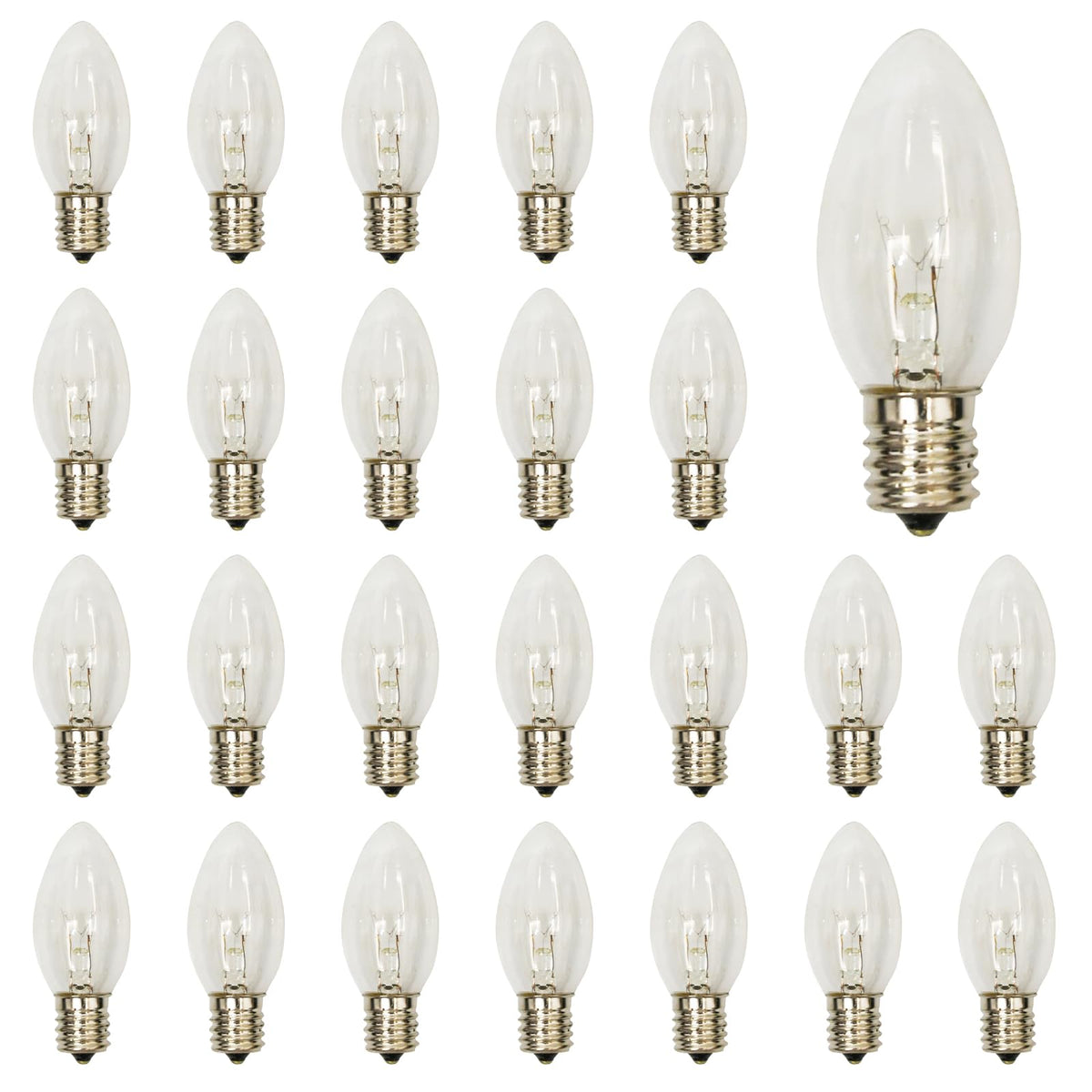 25-Pack of C9 transparent replacement bulbs are perfect for decoration of your house or company for the Christmas season. Our C9 light bulbs have a E17 Intermediate base and measure 3.14" tall and 1.18" wide.