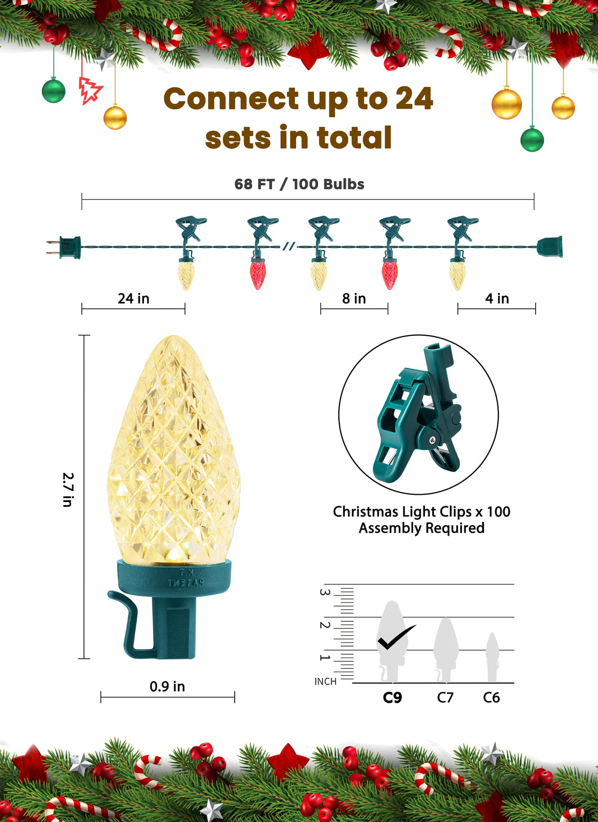 Using This C9 Strawberry Lights String With Quick Clips To Sparkle Your Home Rooflines Patio Deck Fence Or Garden! Specifications: Total Length: 68 Feet Lead Cord: 24 Inches Bulb Spacing: 8 Inches End Cord Length: 4 Inches Bulb Type: Led Shade Material: Plastic Led Bulb Quantity: 100 Pieces Connectable: 24 Sets(Including First Set) Wattage: 9W Bulb Lifespan: 15 000H Lighting Color: Red And Warm White Cable Color: Dark Green Waterproof Grade: Ip45 Power Input: 120V Package Includes: 1 X C9 Xmas String Lights 100 X Quick Clips 1 X Users Manual For Superior Led String Lights For Holiday Select And Order Now!
