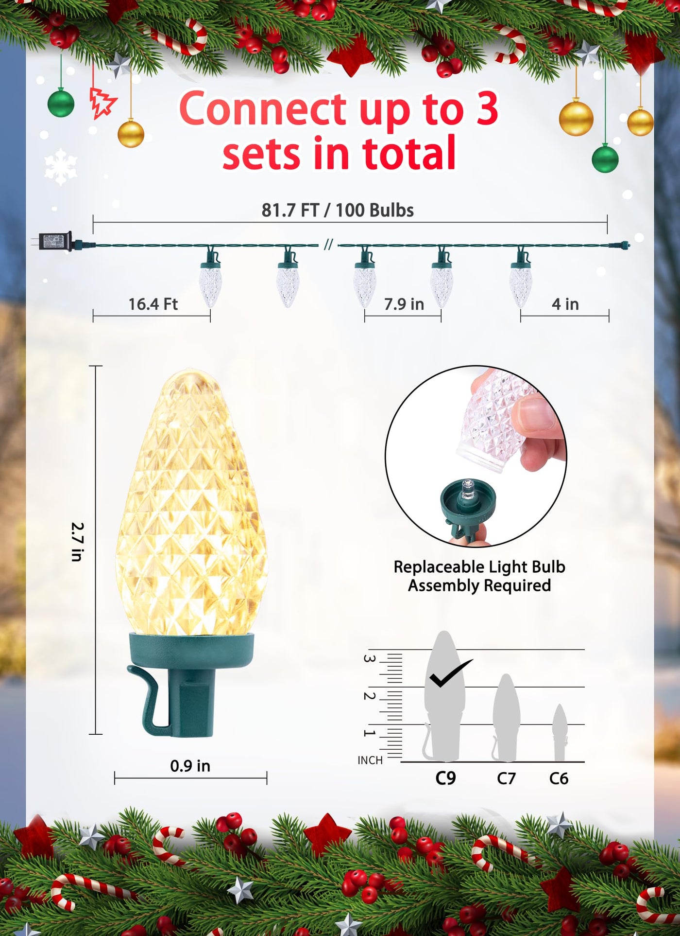 Q: Can I connect multiple sets of these C9 lights together?A: Yes, you can connect up to 3 sets of C9 LED Christmas lights together, allowing for a total length of 245 feet, making it easy to decorate large areas like roofs, patios, or gardens.