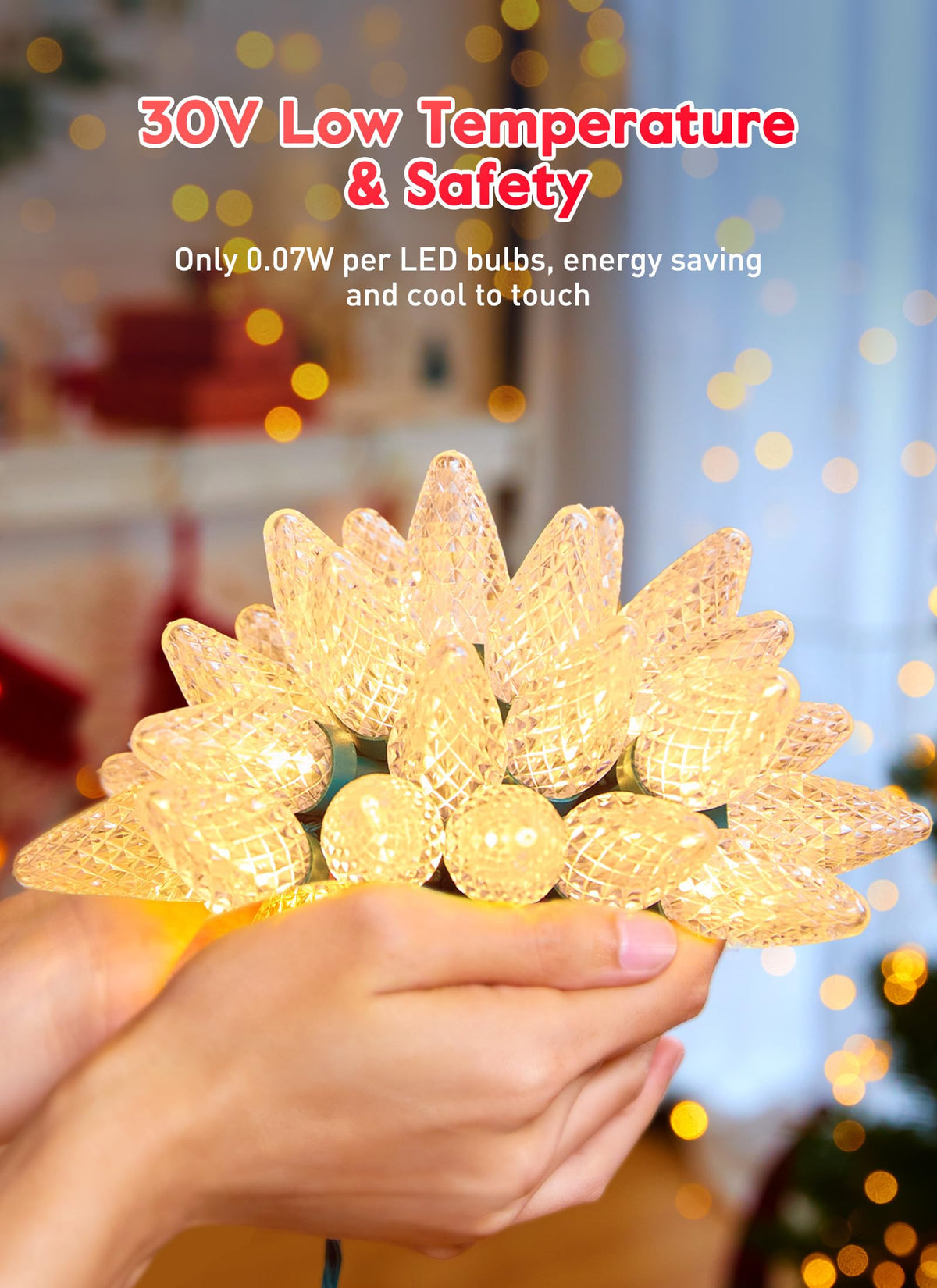 Q: What energy efficiency features do these lights have?A: These C9 LED Christmas lights use a low output 30V adapter and high durability LEDs that can save up to 80% energy compared to traditional incandescent bulbs, ensuring safety and efficiency during extended use.