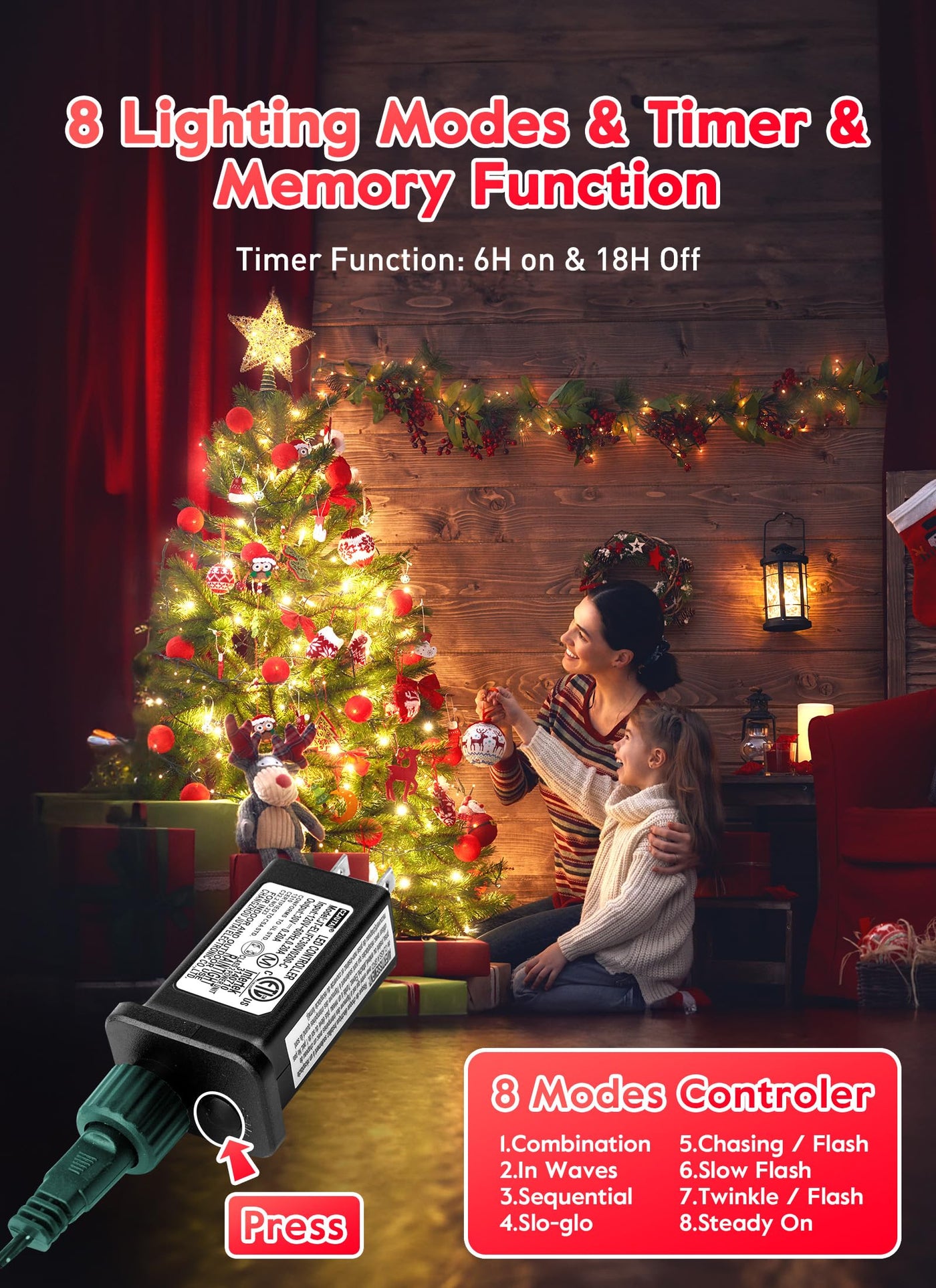Q: What are the available lighting modes for the C9 Christmas lights?A: The C9 LED Christmas lights offer 8 different lighting modes: combination, in waves, sequential, slow glow, chasing/flash, slow fade, twinkle/flash, and steady on, allowing you to create a variety of lighting effects for your holiday decorations.