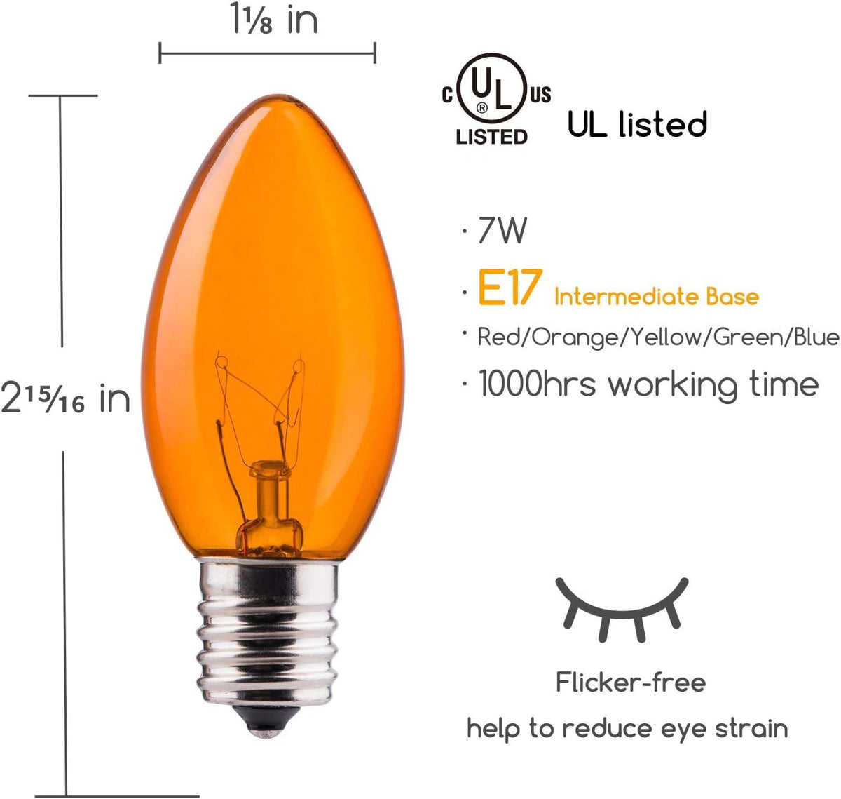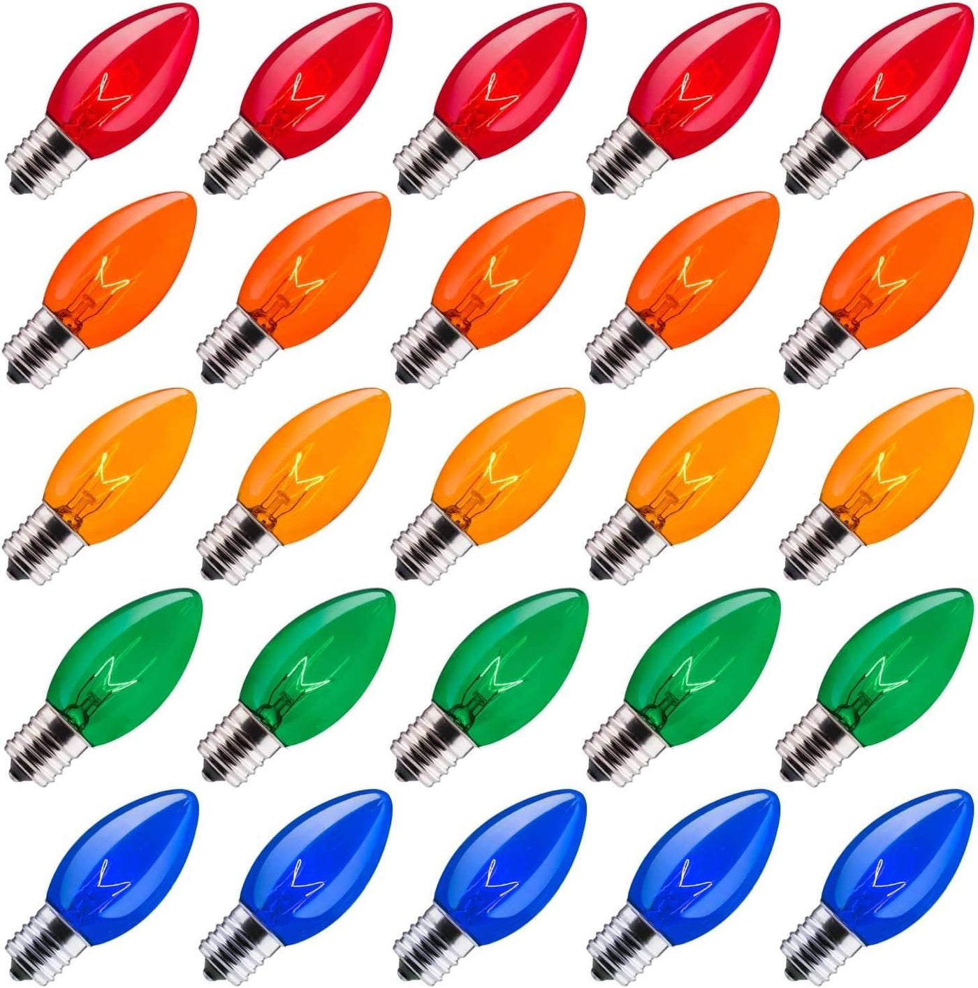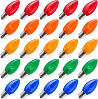 C9 Multicolor Incandescent Bulb, C9 Replacement Light Bulb For Christmas String Light.This Fun Collection Of Light Is Perfect For Lighting Up Outdoor Party, Just Secure Them Along Your Fence Line To Create An Atmosphere Full Of Festive Light! E17 Intermediate Base Pack Of 25 Light Bulbs Multicolor Replacement Glass Bulbs For C9 Strands Ul Listed For Indoor And Outdoor Commercial Uses. 7 Watt Each Bulb