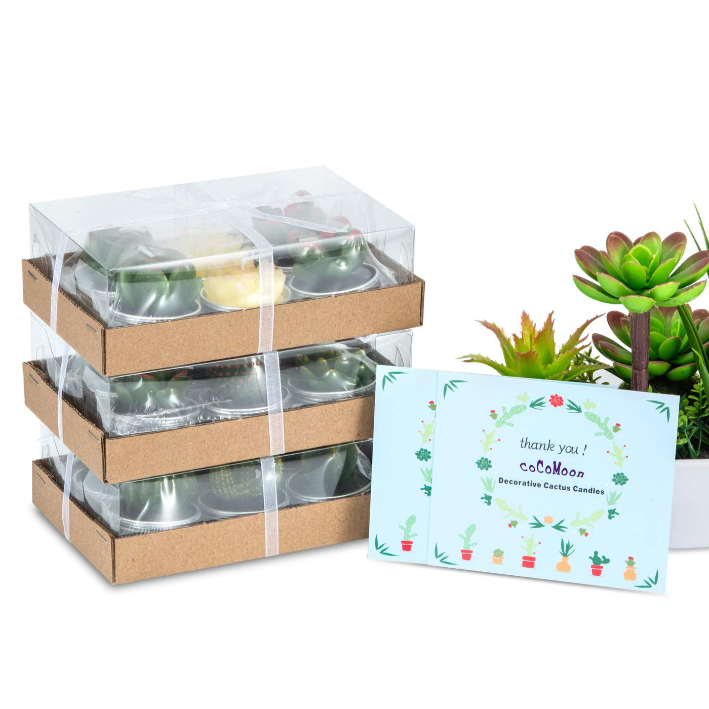 Q: What is included in the package of Cactus Tealight Candles?A: The package includes a total of 18 handmade cactus candles in different shapes, along with a thank you card.