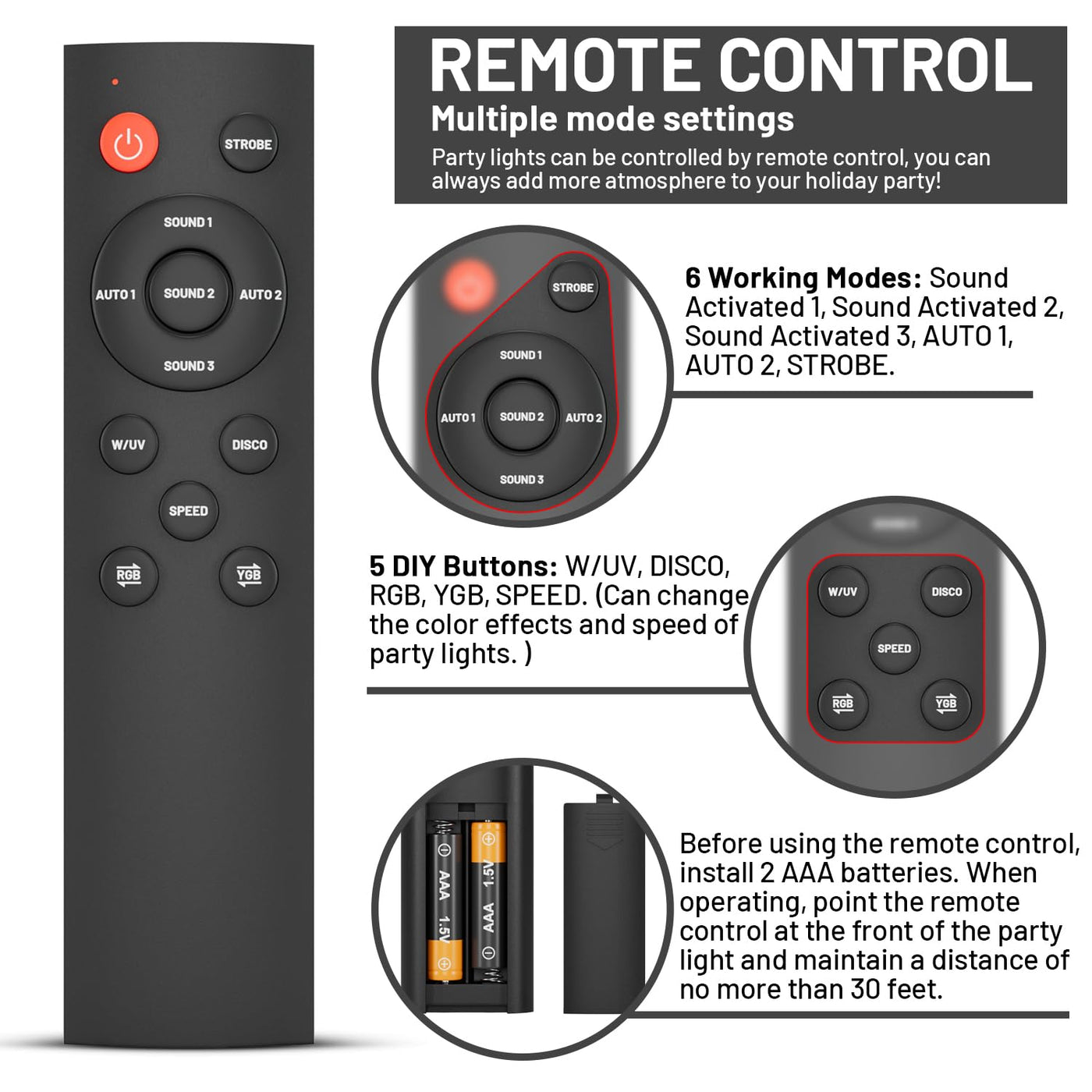 Q: What lighting modes are available with the remote control?A: The remote control offers six working modes including three sound-activated modes, two automatic modes, and one strobe mode, allowing for diverse lighting effects.