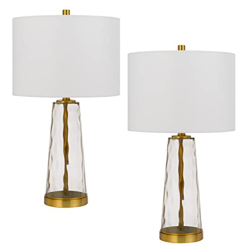 Add a touch of glam to your space with this exquisite set of ripple glass table lamps. Designed to enhance any room's aesthetic, these lamps feature a striking combination of durable glass construction and elegant antique brass accents. Perfect for both modern and traditional decor, they come complete with crisp white fabric shades that beautifully diffuse light, creating a warm and inviting atmosphere.