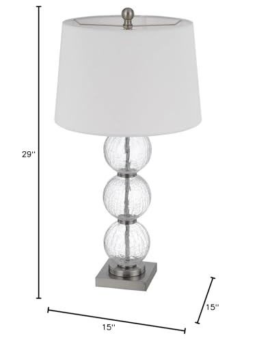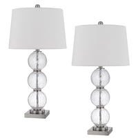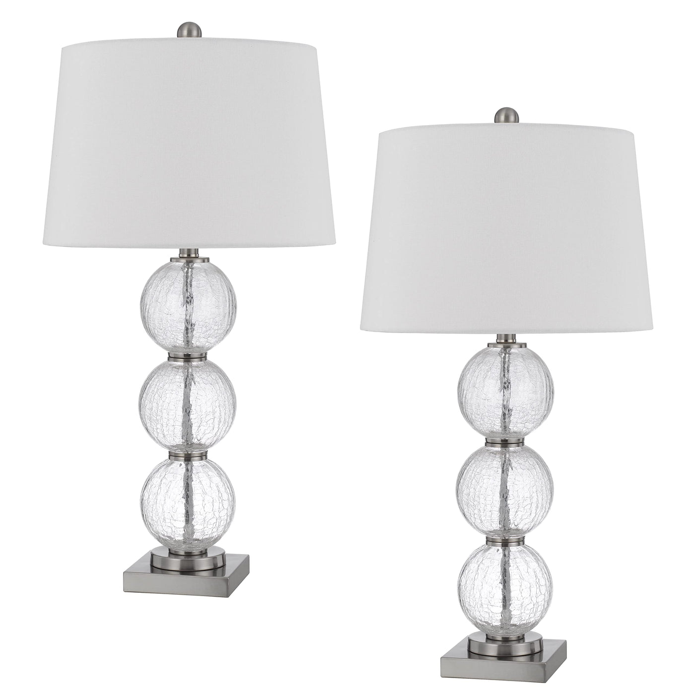 Add a touch of glam to your space with this stunning set of stacked orb table lamps. With a unique design featuring a crackle glass body and a sleek brushed steel metal platform base, these lamps are sure to elevate any décor. Each lamp comes complete with a crisp white fabric shade and a matching finial, making them not just functional lighting but also a stylish accent piece for your home.