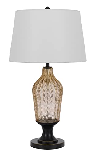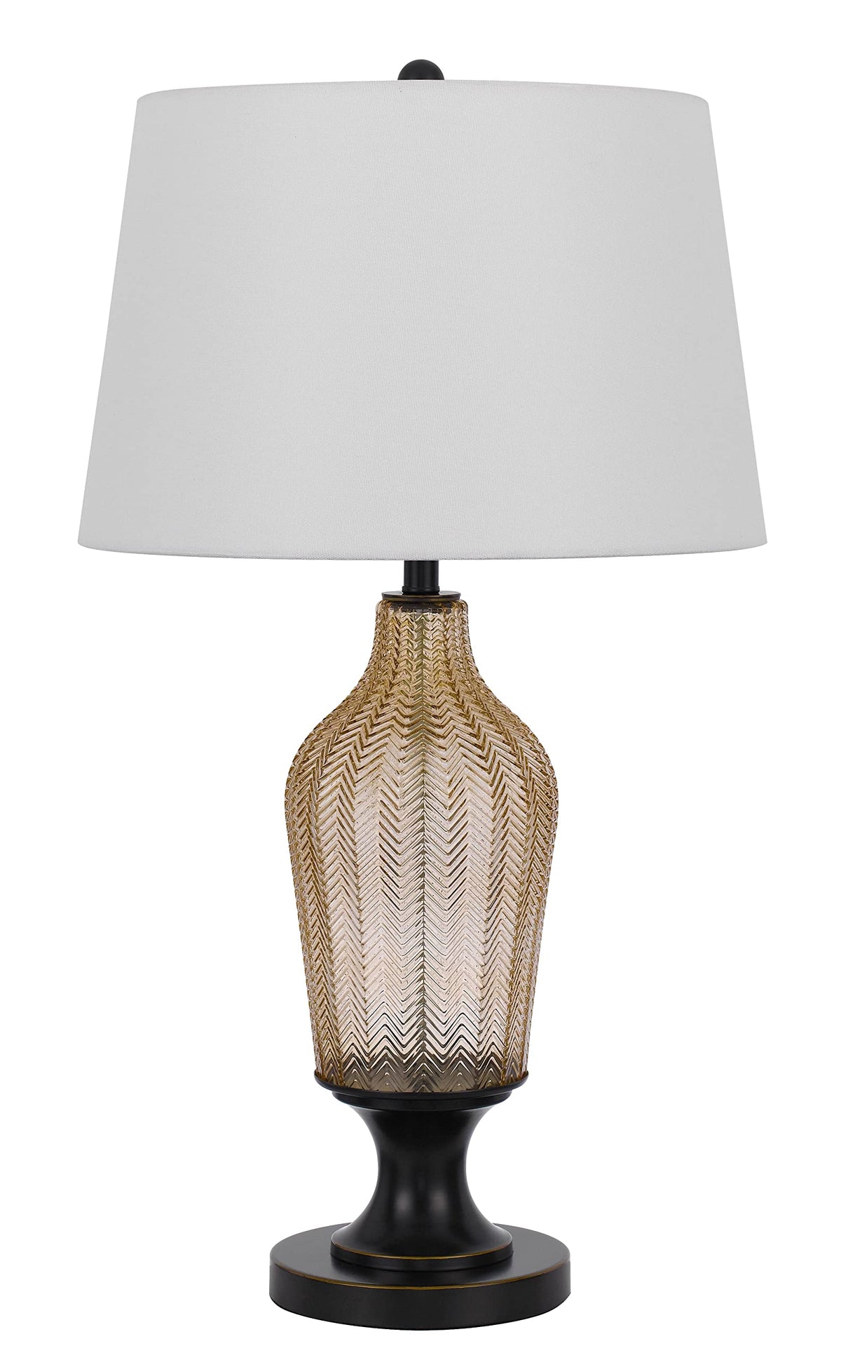 Create a warm and inviting atmosphere in your space with this smoked glass table lamp. It features a texturized chevron print finish with a solid dark bronze weighted base for added stability.The lamp is topped with a white fabric hardback shade and match