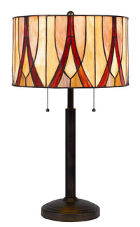 Q: What is the design style of the Cal 60W x 2 Tiffany Table lamp?A: The Cal 60W x 2 Tiffany Table lamp features a classic Tiffany design with a patterned hand-painted glass shade and an antique bronze finish, adding a touch of elegance and color to any room.