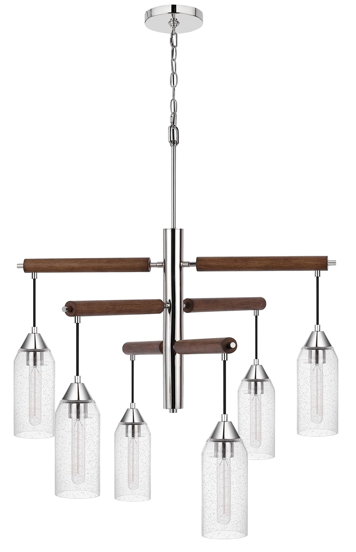 Cal 60W X 6 Rubber Wood Chandelier, Chrome With Glass Shades, Modern Lighting Fixture