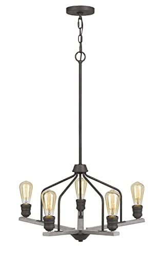 Q: What finish does the Cal Lighting FX-3716-5 chandelier have?A: This chandelier features a Textured Bronze/Drifted Wood finish, providing a transitional style that complements various decor.