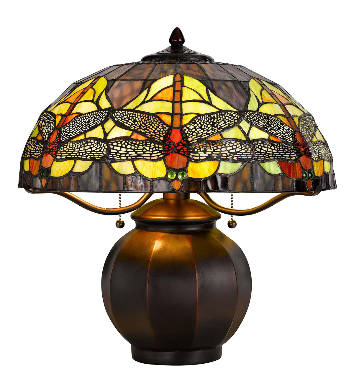 Add a touch of color to your décor with this this Art color glass tiffany lamp. It features a stained glass Dragon Fly design and a dark bronze metal and resin body. The lamp has rounded faceted base and a double pull chain with ball tips for easy access.