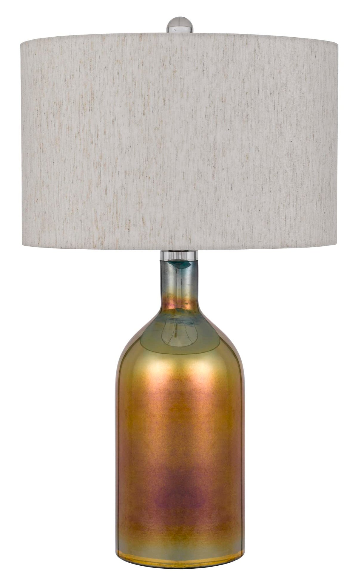 This casual yet elegant table lamp is a stylish way to refresh your rooms look. It features a classic wine bottle style silhouette with a striking iridescent patina finish . The lamp has clear glass accents and finial and is topped with a linen hardback f