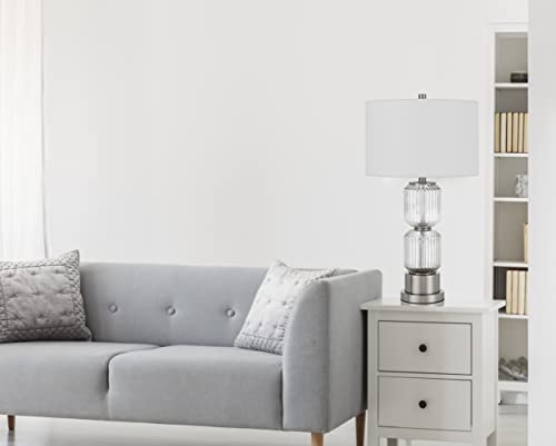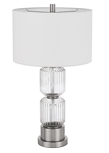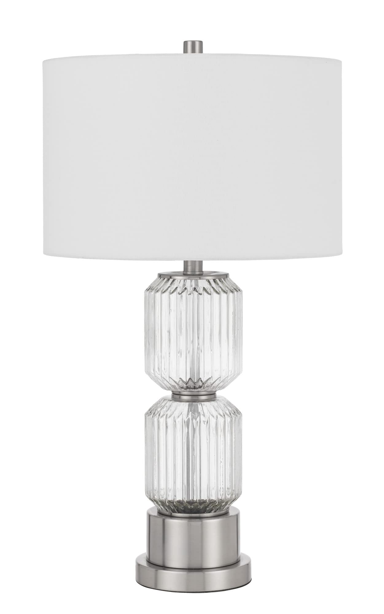 Combining metal and crystal material, this lovely transitional table lamp set is designed to elevate your home decor. Topped with a tall drum fabric shade, it features a fluted clear glass body complemented by contrasting smooth metal accents. With clean lines and neutral colors, this lamp is sure to enhance the ambiance of any room, providing both style and functionality.