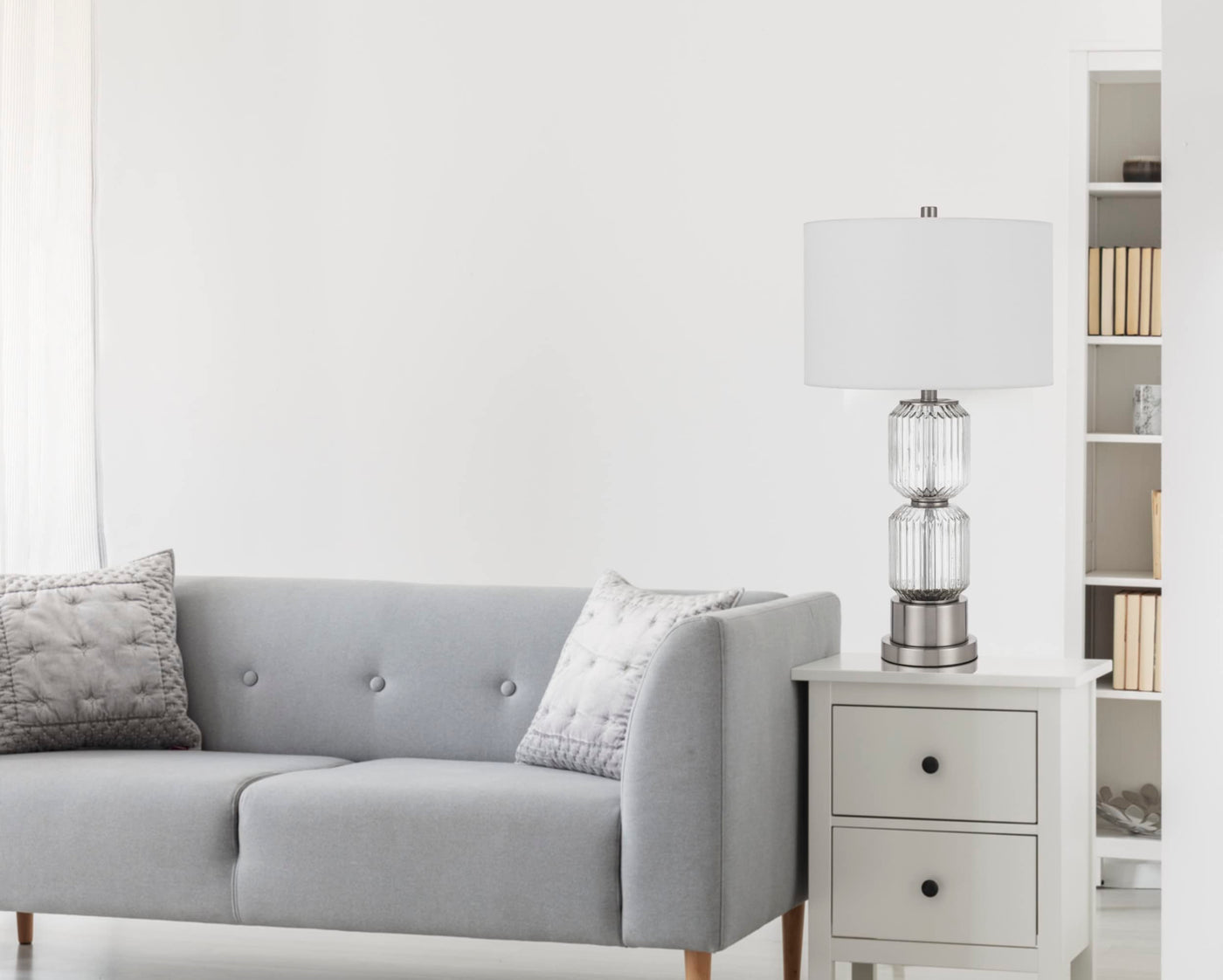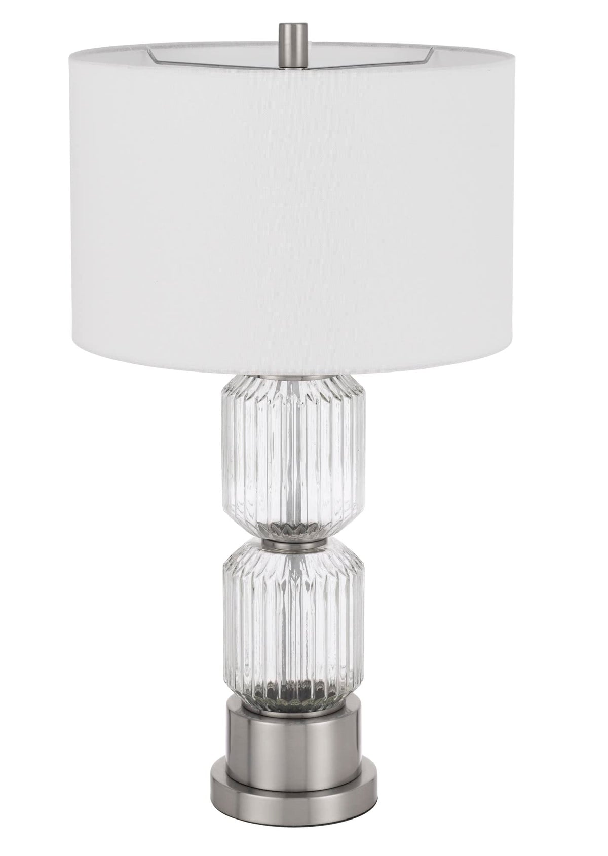Q: What materials are used in the construction of this table lamp?A: This table lamp features a durable glass construction with a fluted glass design and contrasting smooth metal accents in brushed steel.