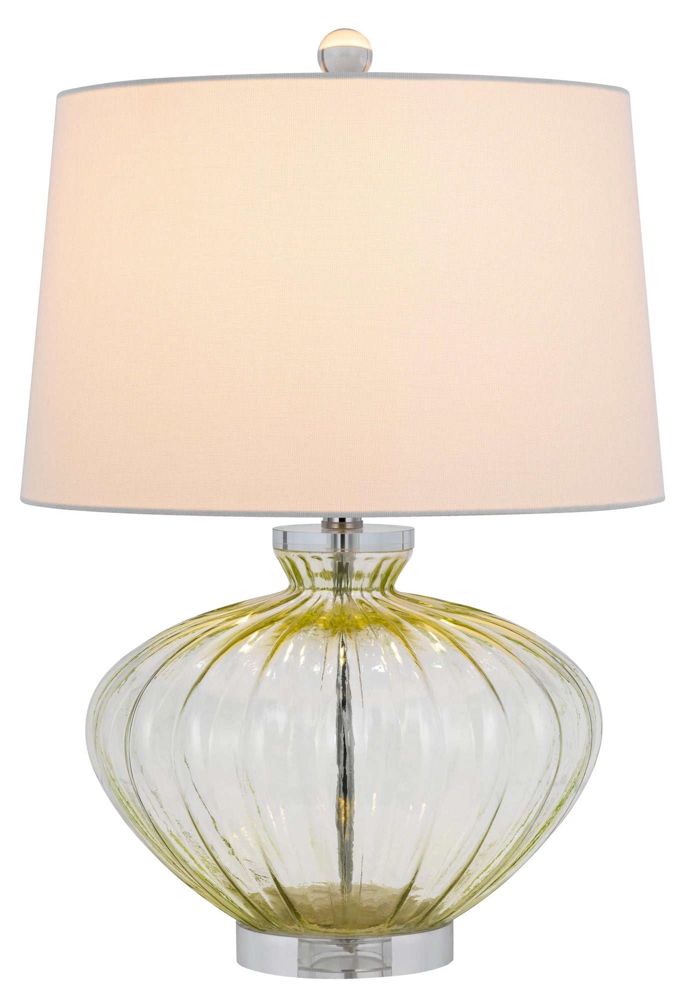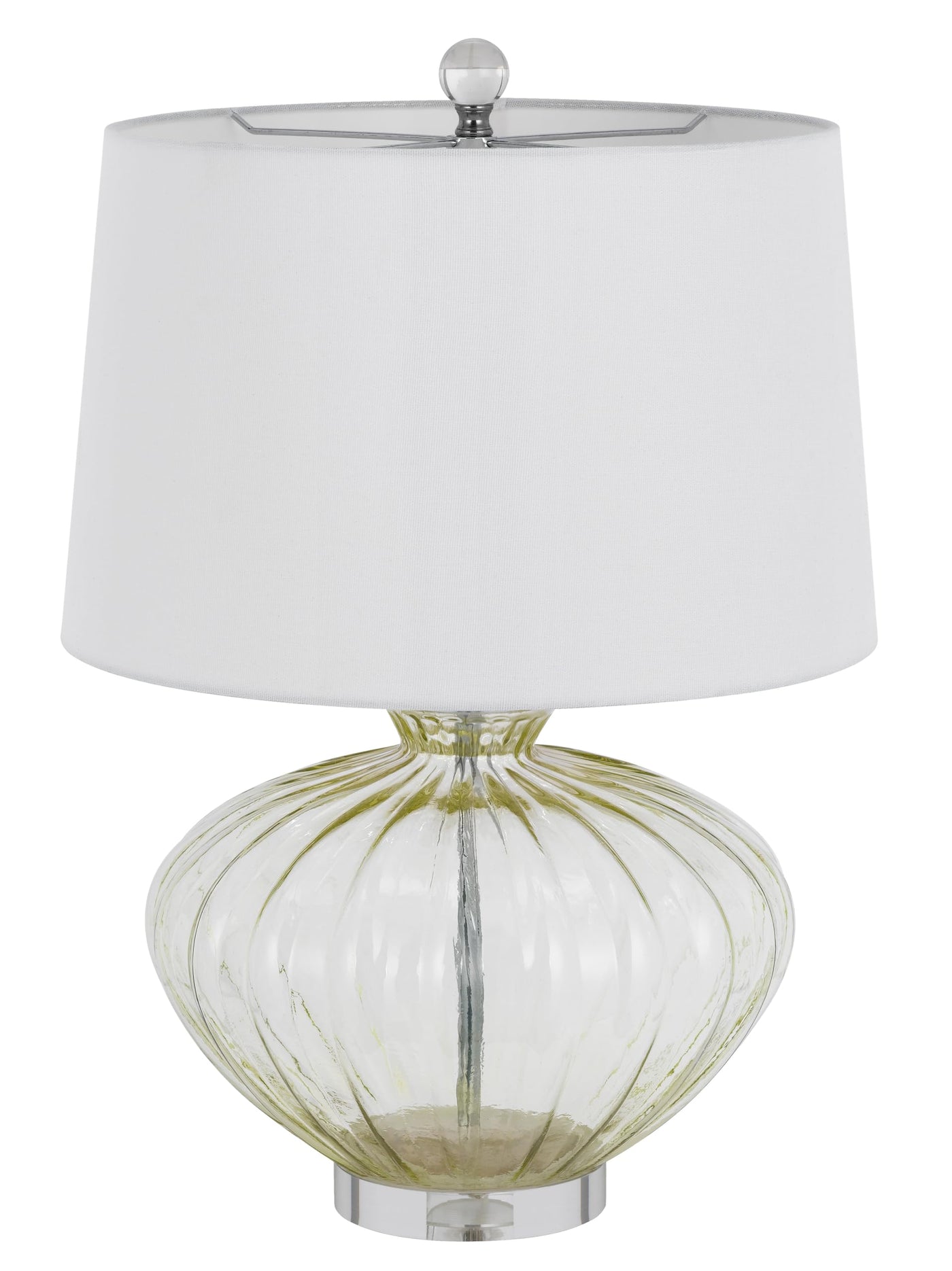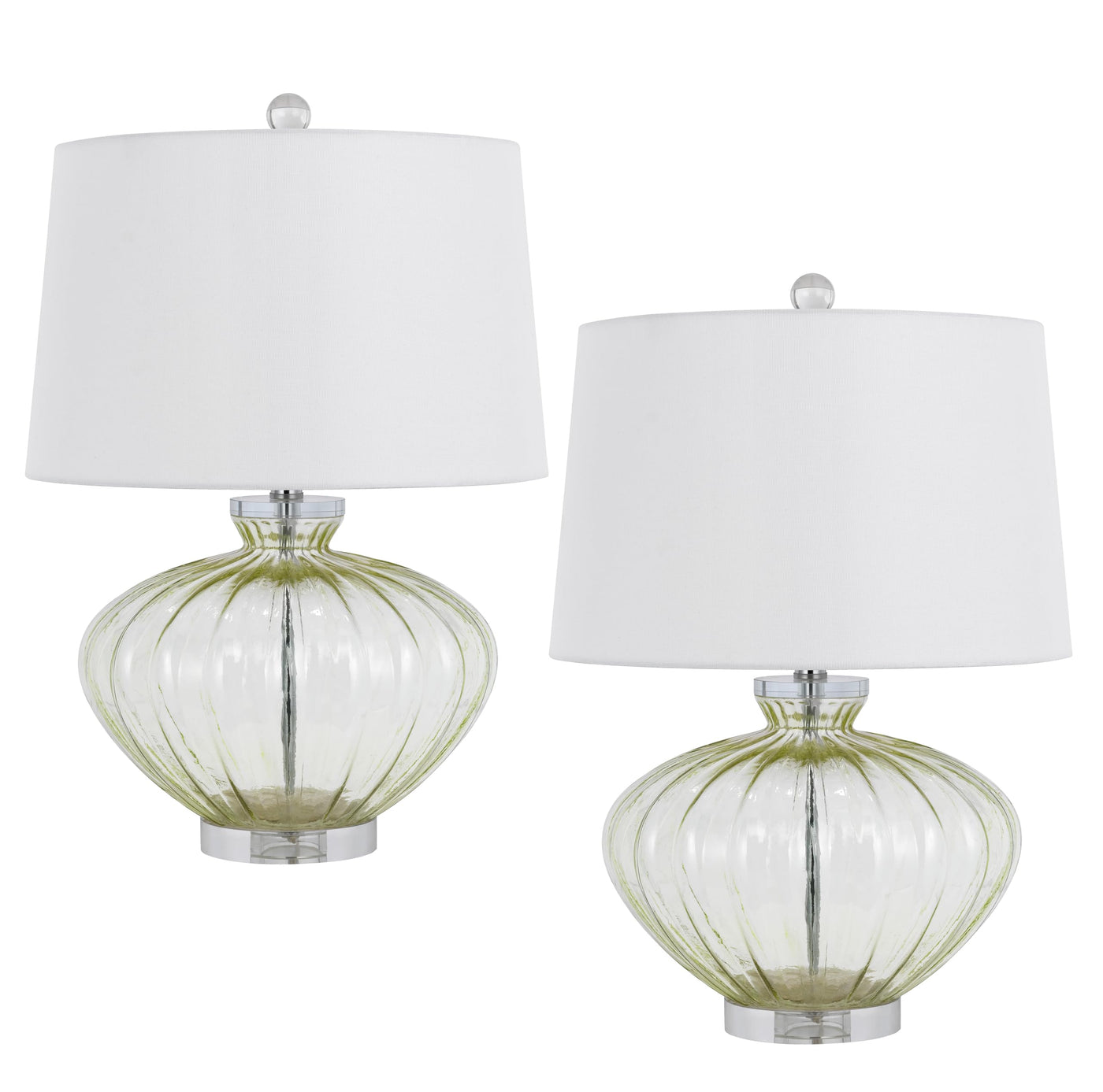Brighten your space with the elegant charm of this matching pair of tinted glass table lamps by Cal Lighting. Designed to elevate your décor, these lamps feature a unique pump shape and a stunning circular crystal base, making them a perfect choice for any room in your home. Each lamp comes complete with complementing white shades, providing a warm and inviting glow to your living space.