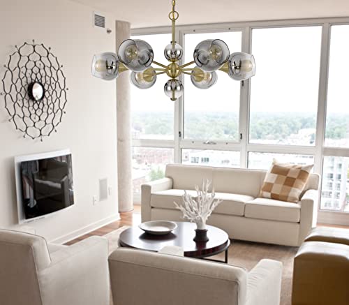 With a spider type design, this elegant chandelier is a stylish accent piece for any entry way, living room or dining room. It features a brushed antique brass finish with silver hand blown smoked glass electroplated shades. The fixture comes with matching canopy and chain.
