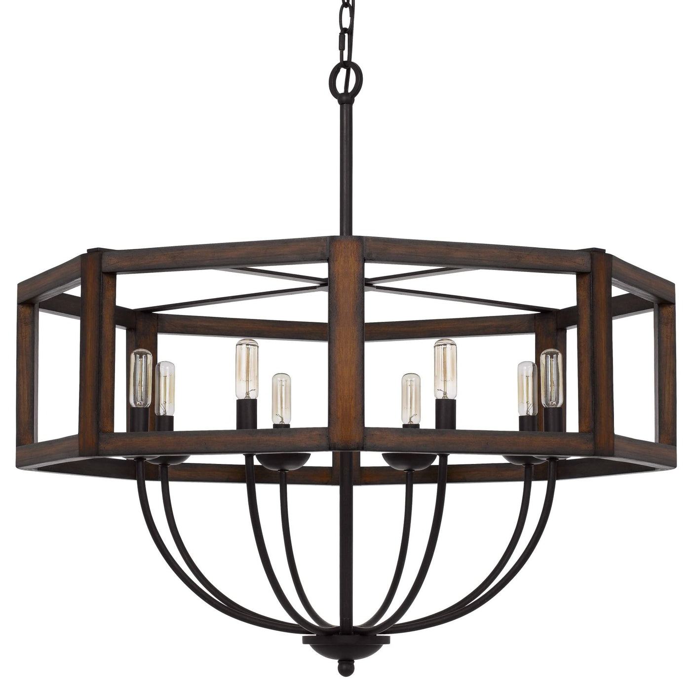 This stylish chandelier marries together both industrial and modern styles with this wood and metal finish fixture. It features an oak color rubber wood frame with dark bronze metal accents. It's geometric openwork style will make an eye catching addition to any foyer, living room or dining area.