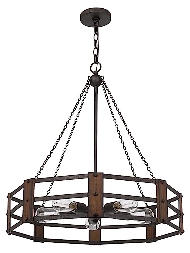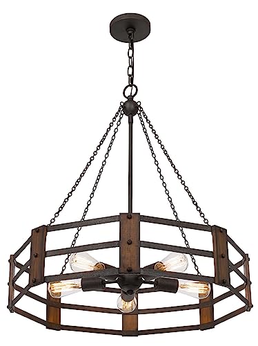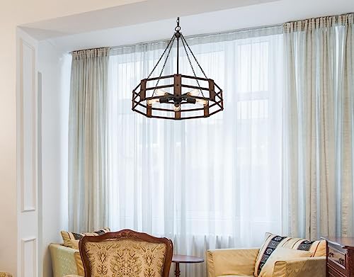 Illuminate your space with this stylish chandelier that seamlessly blends industrial and rustic aesthetics. Crafted with a stunning oak color rubber wood frame and accented by matte iron metal, this fixture is designed to be a striking centerpiece in any room. Its geometric openwork style adds a modern touch to traditional decor, making it an eye-catching addition that enhances the ambiance of your home.
