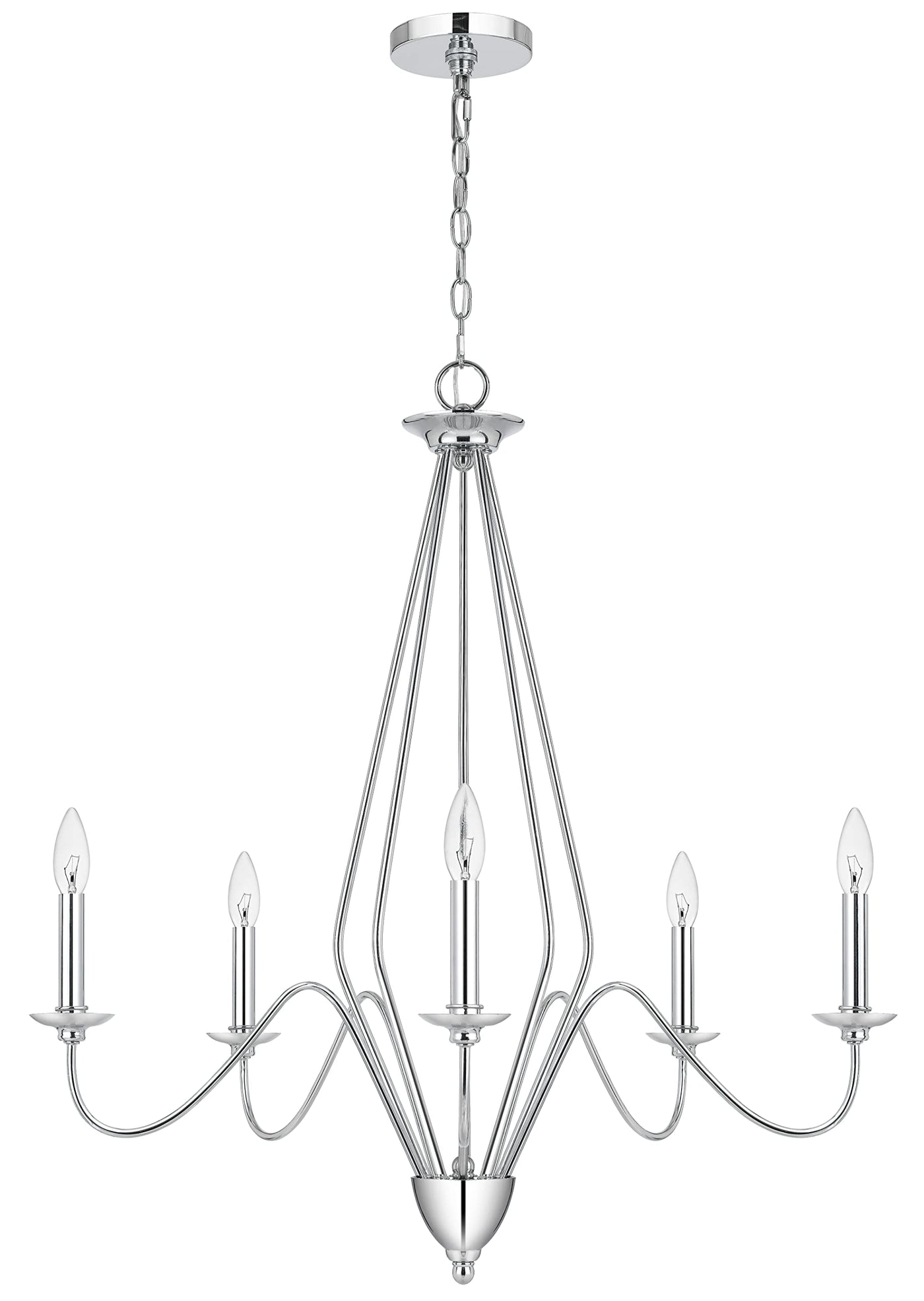 Q: What size room is suitable for this chandelier?A: The Cal Lighting FX-3774-5 chandelier, with its dimensions of 30"W x 32.13"H, is ideal for medium to large living spaces, dining rooms, or entryways, providing ample illumination and a modern aesthetic.