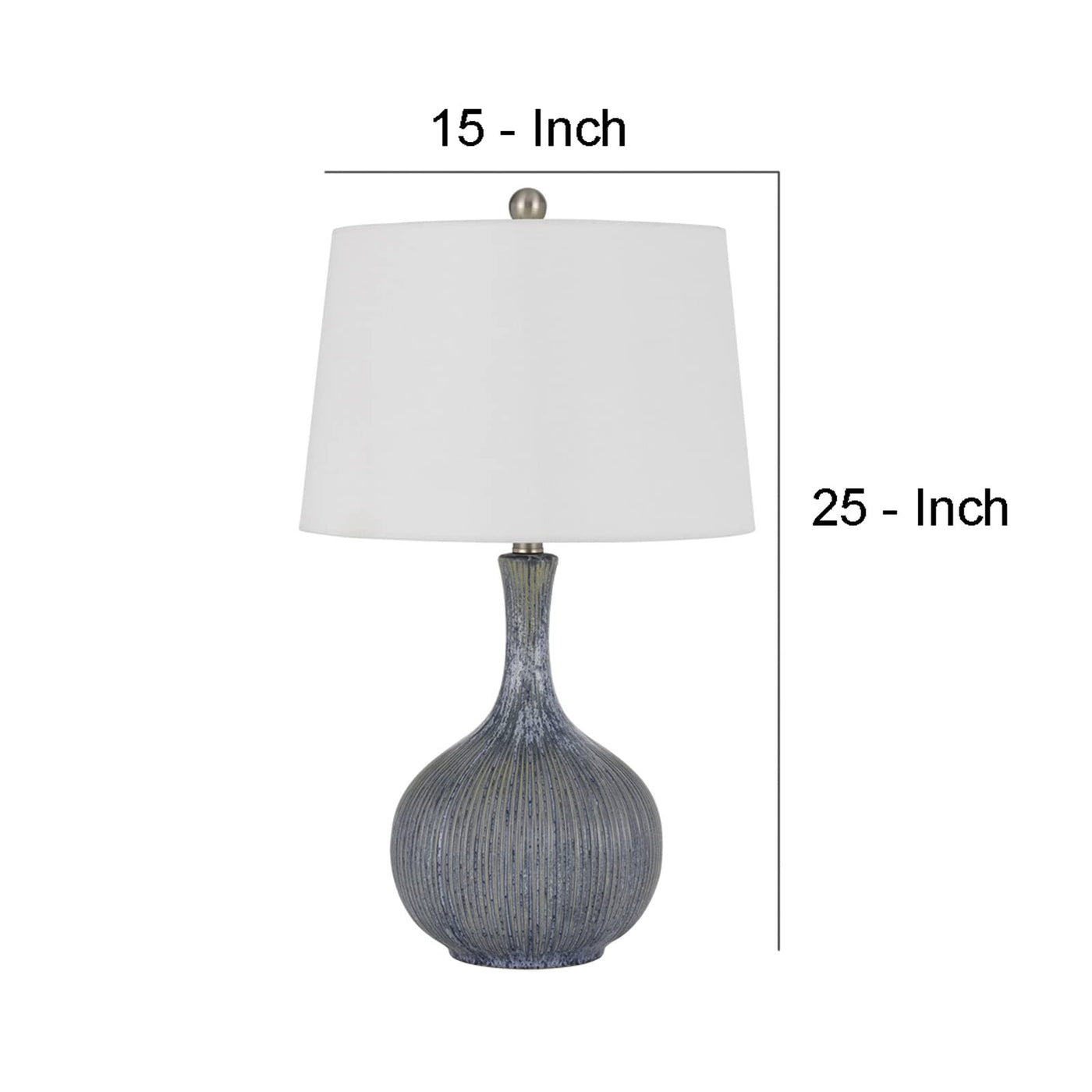 Q: What are the dimensions of the Cal Lighting BO-3036TB Vernate Ceramic Table Lamp?A: The Cal Lighting BO-3036TB Vernate Ceramic Table Lamp has dimensions of 15 inches in width and 25 inches in height.