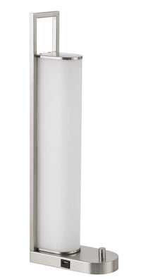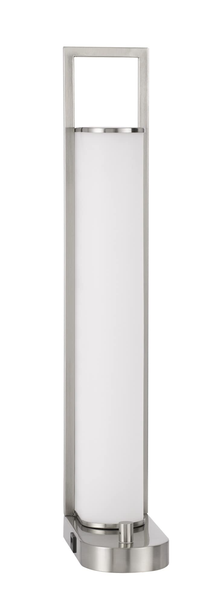 Q: What are the key features of the Cal Lighting LA-8032DK-1 Zamora LED Table Lamp?A: The Cal Lighting LA-8032DK-1 features durable metal and acrylic construction, a modern brushed steel finish, a slim column-like design, and an acrylic shade panel that provides softer lighting. It includes a dimmer switch for adjustable brightness and two convenient USB charging ports built into the base.
