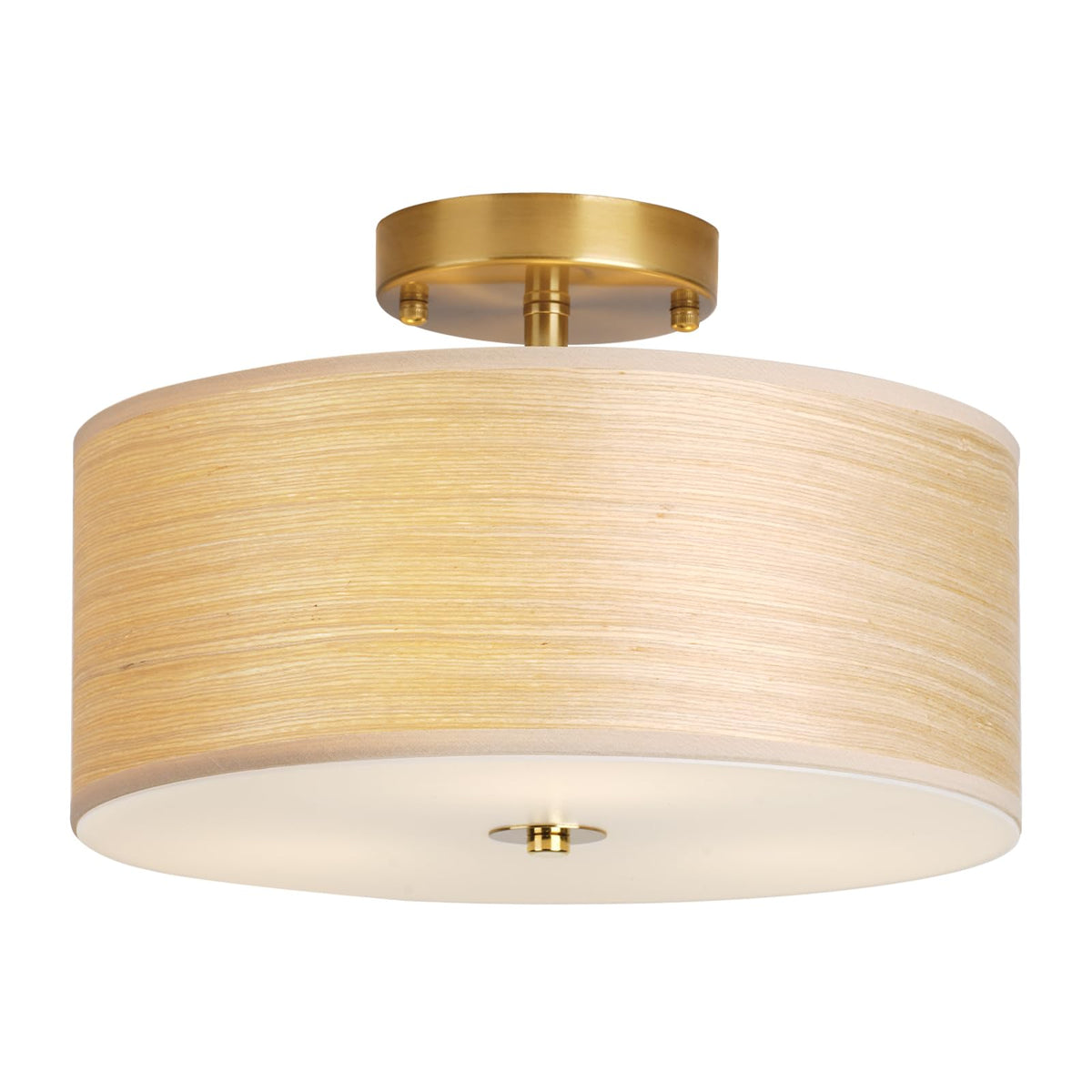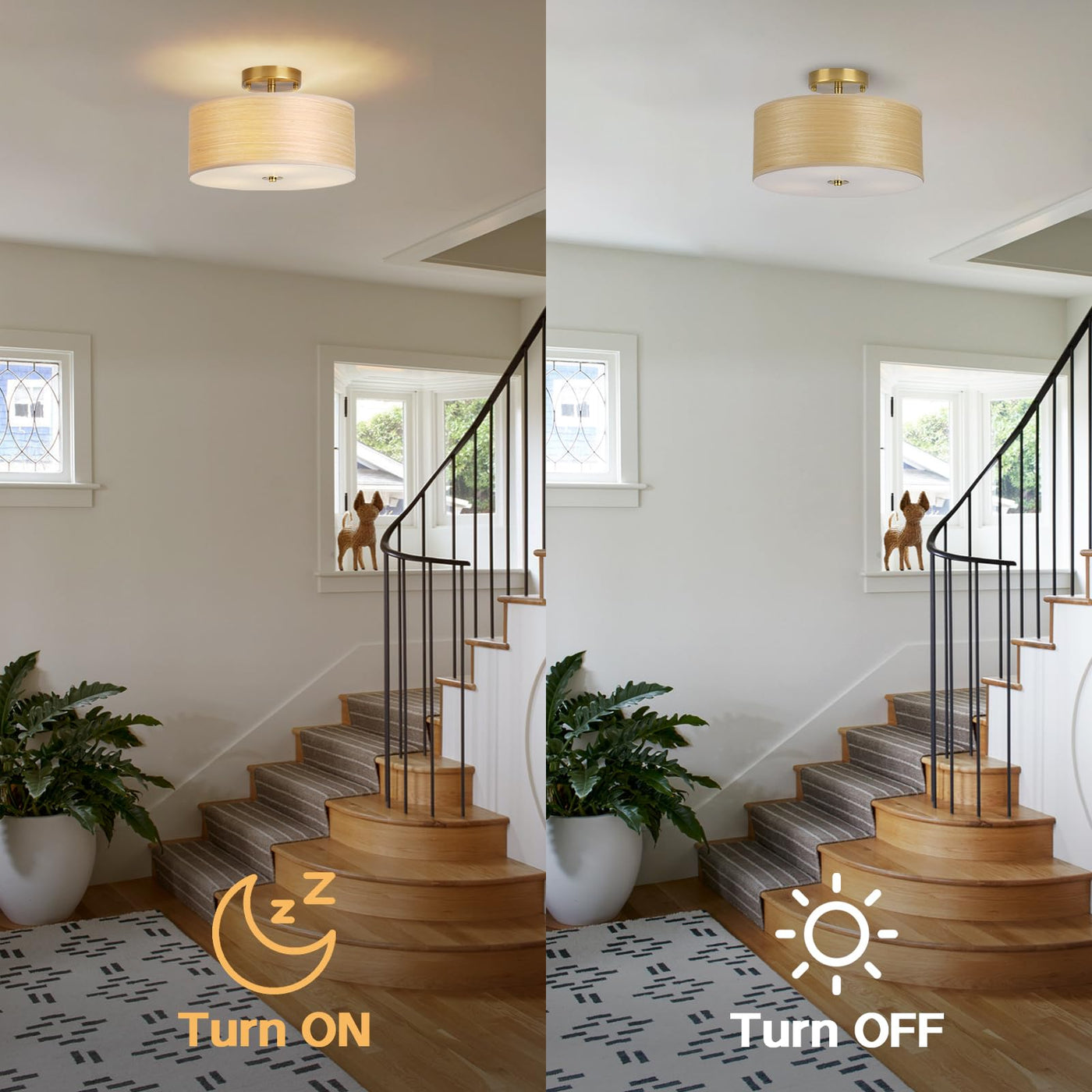 Calokes Gold Drum Ceiling Light Fixture, 13'' Semi Flush Mount With Natural Wood Shade, Modern Farmhouse Close To Ceiling Lamp F