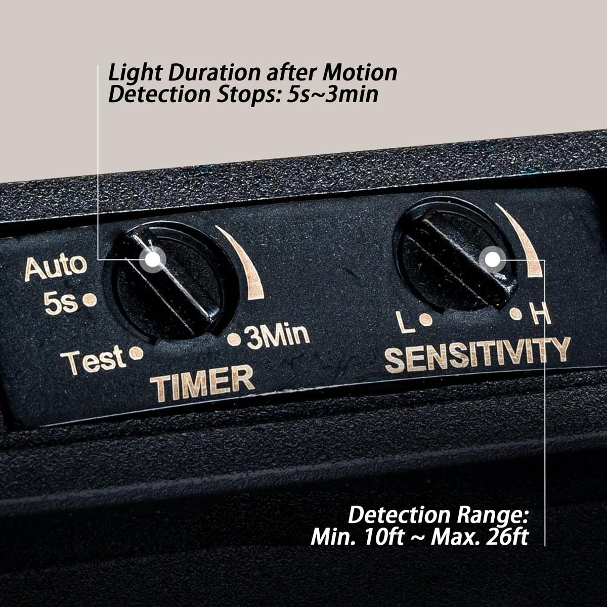 Q: Can the sensitivity and timer of the motion sensor be adjusted?A: Yes, the motion sensor features an adjustable sensitivity and timer panel, allowing you to customize the timer from 5 to 180 seconds and a maximum detection range of 26 feet.