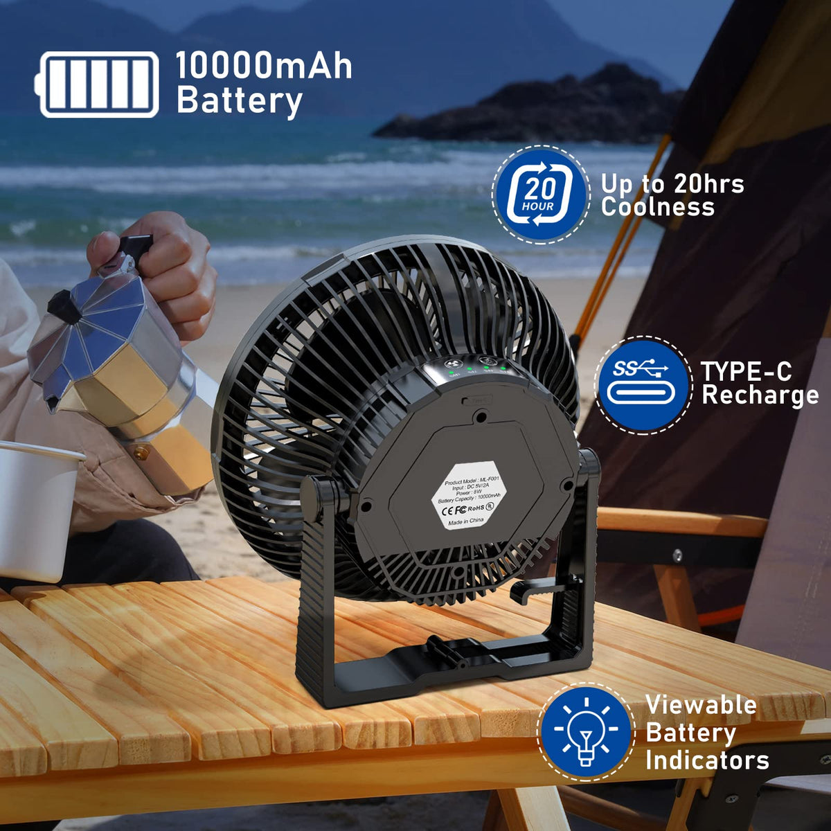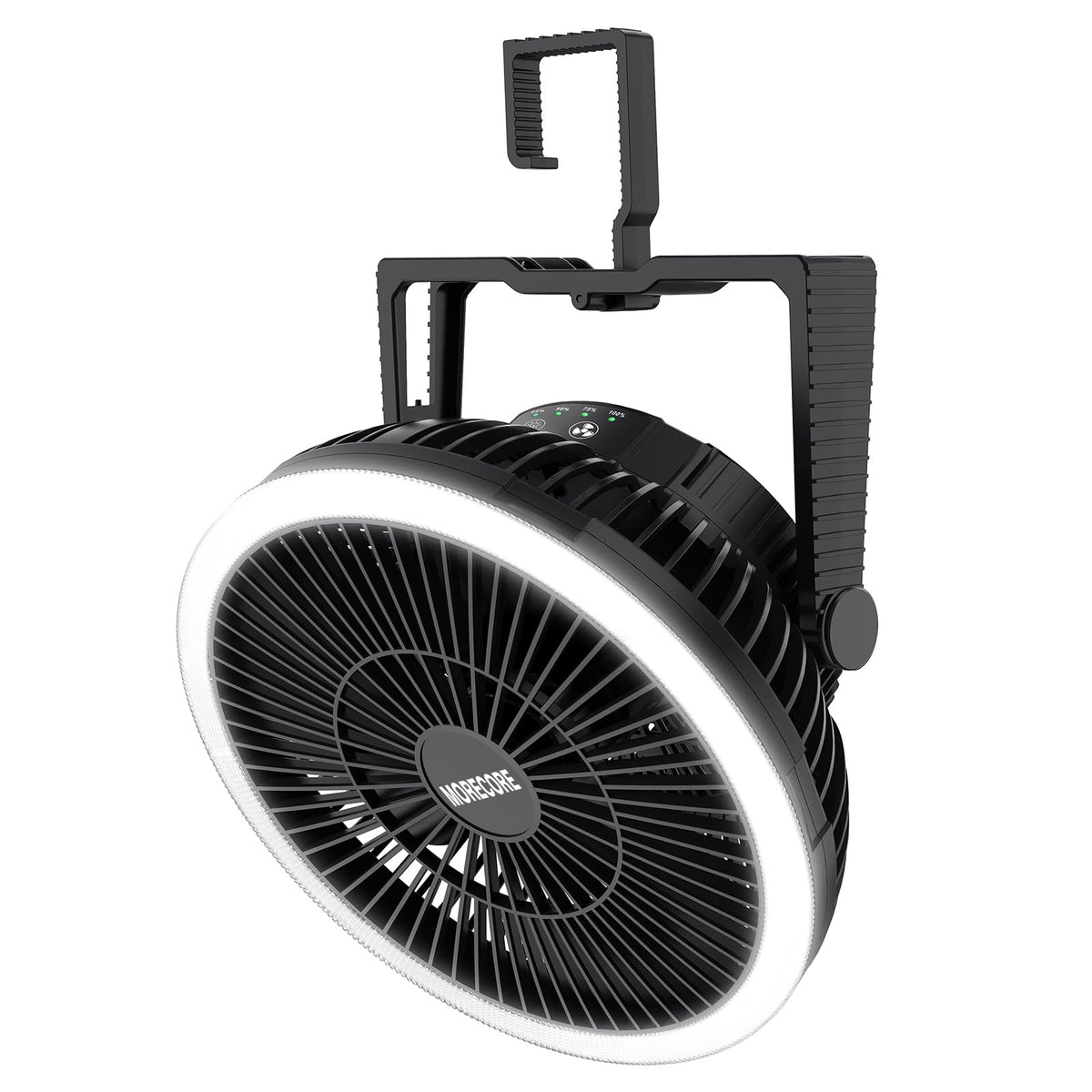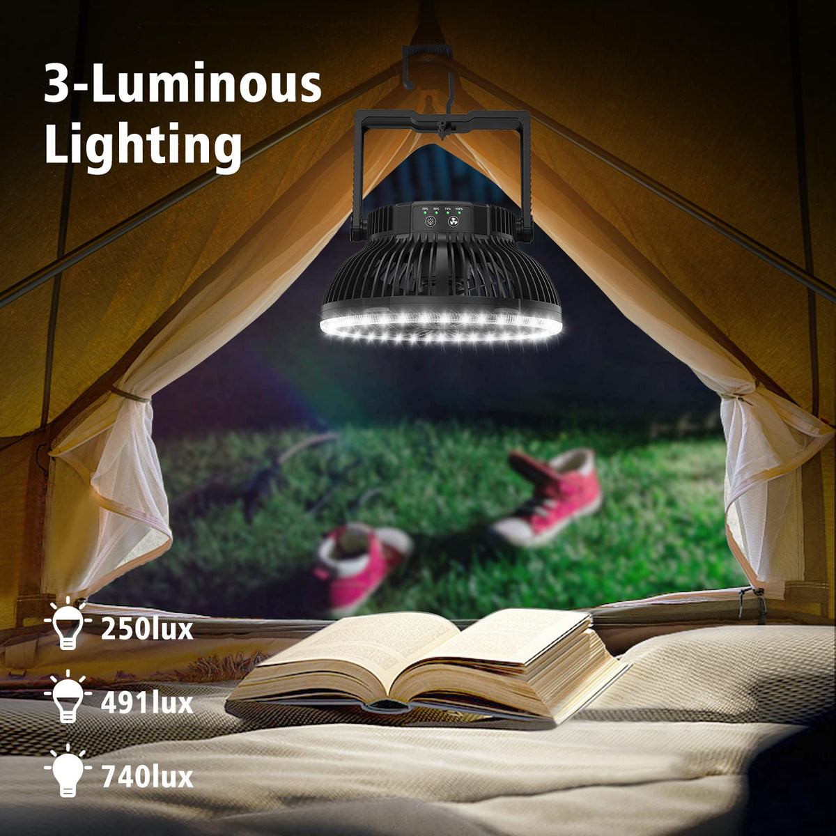REAL 10000mAh BATTERY: This cordless fan with built-in polymer rechargeable battery, save you from buying additional batteries, supports the fan to run up to 20 Hours, grant you a cozy outdoor night without worry of battery running out, a must take gear for camping, fishing, hiking and a survival kit for emergencies like hurricane storm | REAL 20.32 CM FAN: This portable fan is much bigger than others, thus providing stronger air blowing, cool down faster and cover larger area than those mini fans, it works great for 2-6 person camping tents or ice fishing shelters when attached on the ceiling | SUPER BRIGHT LED LIGHT: Embedded with 36 LED beads with 3 brightness (MAX 740 LUX), the camping lantern can light up your whole tent, campsite and small rooms. It’s so bright that you can read book underneath and DIY on your garage | HANG/STAND: Our personal fan has a foldable hook, you can hang it on tents, cars, branches, wall; the handle can work as stand, when folded, it sits steady on your office desk, end table, countertop; versatile for both indoor and outdoor | USER FRIENDLY: Fan and light are controlled by separate button, so they can work together or separately; adjustable handle for easy carry, when folded, it is space saving for storage; powered by rechargeable battery and USB C port for easy recharge, keep you stay cool while energy saving